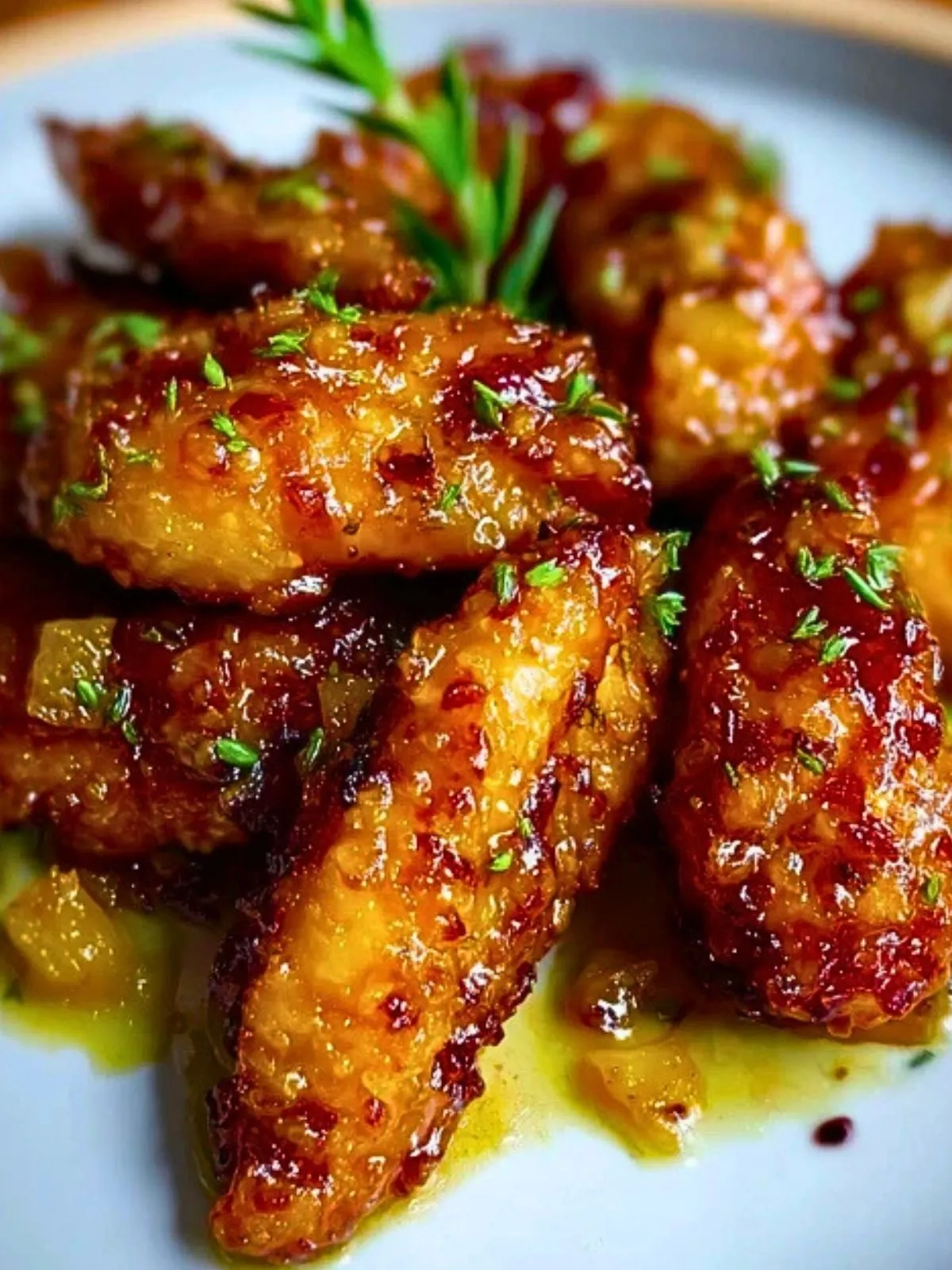 La sauce enveloppe chaque aile d’un glaçage doré, parfumé, avec une pointe de gingembre et d’ail. Quelques dés d’ananas frais viennent apporter une fraîcheur qui équilibre la gourmandise, le tout saupoudré de graines de sésame pour la touche finale. Succès assuré à chaque bouchée !