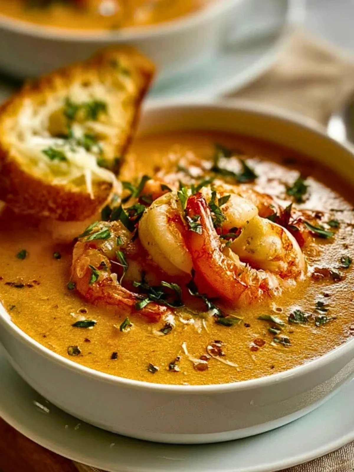 Servez la bisque bien chaude, parsemée de persil frais ciselé et accompagnée de tranches de baguette grillée. Pour une touche encore plus gourmande, ajoutez un filet de crème ou quelques crevettes entières en décoration.