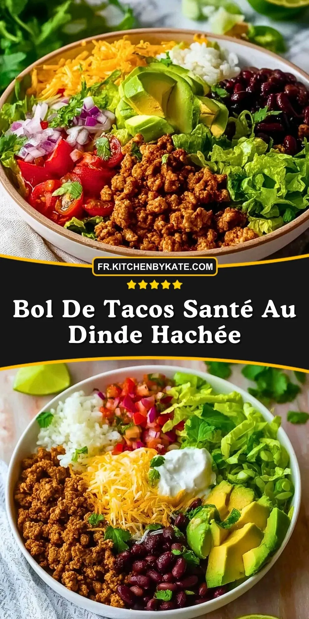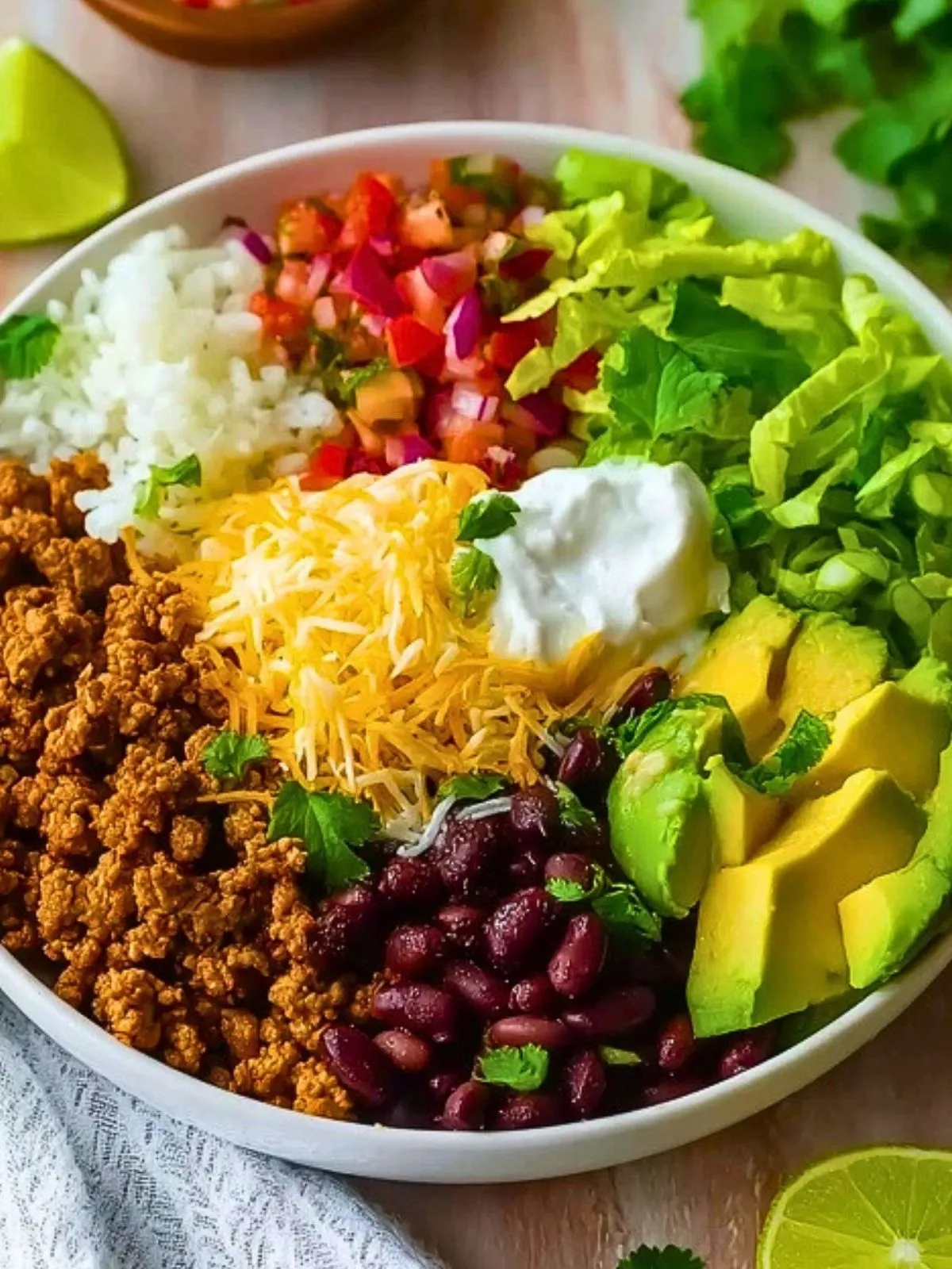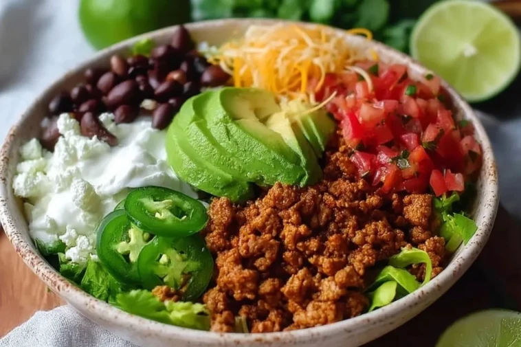 Ce bol de tacos santé à la dinde hachée réunit une viande savoureusement épicée, des légumes croquants, des haricots noirs, de l’avocat fondant et une touche crémeuse de yaourt grec. Facile à préparer et plein de fraîcheur, c’est un repas complet, équilibré et parfait pour les soirs de semaine.