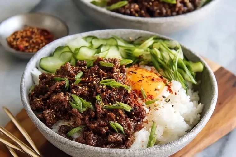 Des bols généreux garnis de riz blanc, de bœuf haché caramélisé dans une sauce soja-sésame légèrement pimentée, de concombre croquant et d’un œuf au jaune fondant. Une recette rapide, savoureuse et équilibrée, parfaite pour un dîner de semaine plein de contraste et de réconfort.