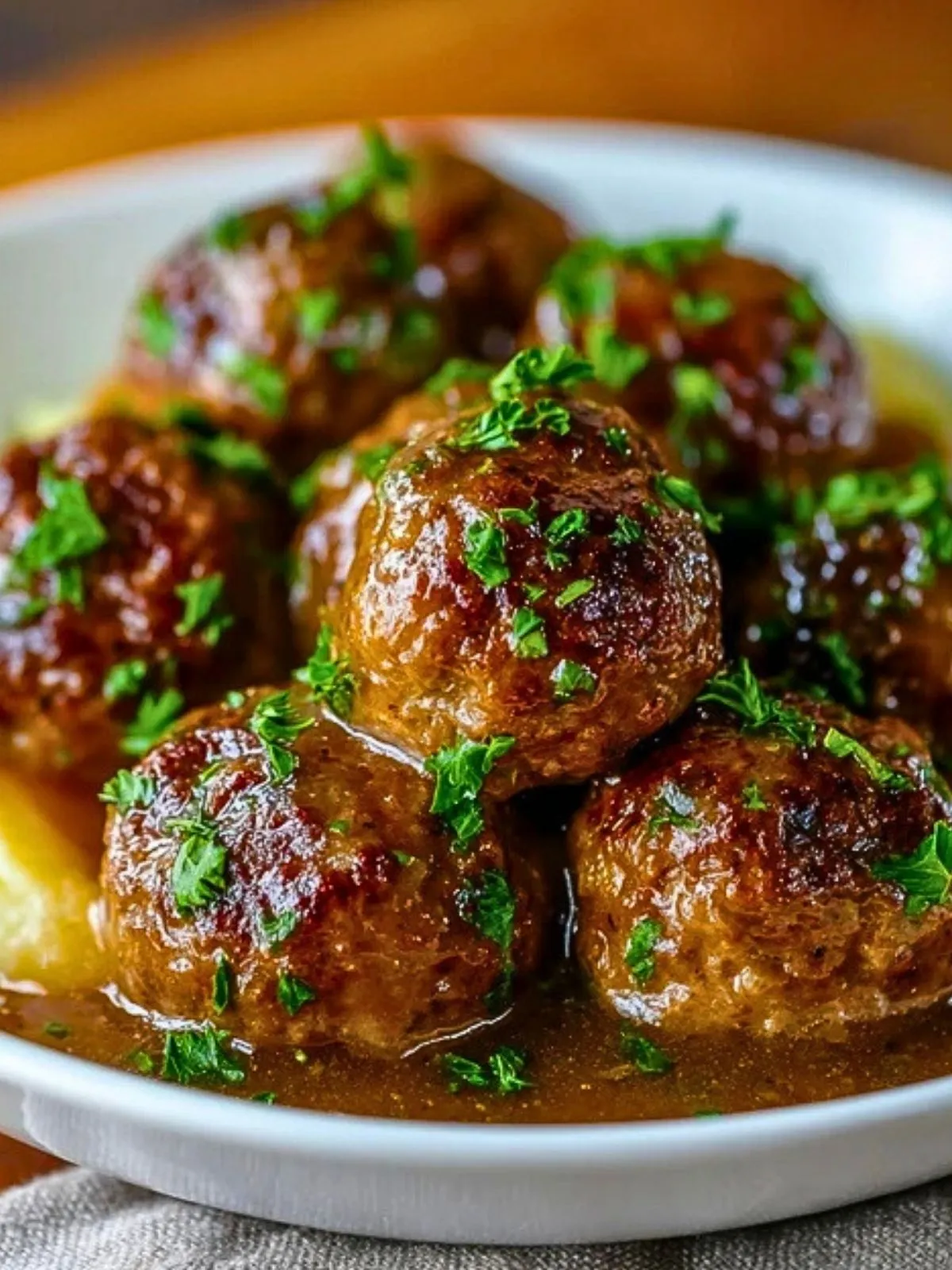 Servez les boulettes de viande à la sauce sur purée bien chaudes, idéalement dans des assiettes préchauffées pour que la purée reste onctueuse plus longtemps. Accompagnez de haricots verts, de brocoli vapeur ou d’une salade verte croquante pour apporter une note de fraîcheur. Ce plat se marie aussi très bien avec un peu de moutarde à l’ancienne servie à côté.