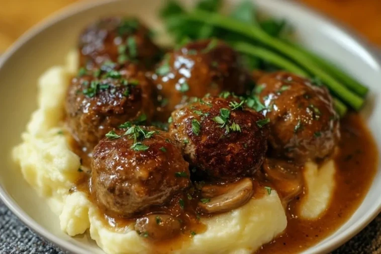 Boulettes de viande ultra moelleuses mijotées dans une sauce brune aux champignons et servies sur une purée de pommes de terre maison bien crémeuse : un plat complet, généreux et réconfortant, parfait pour les soirs de semaine comme pour un repas familial du dimanche.