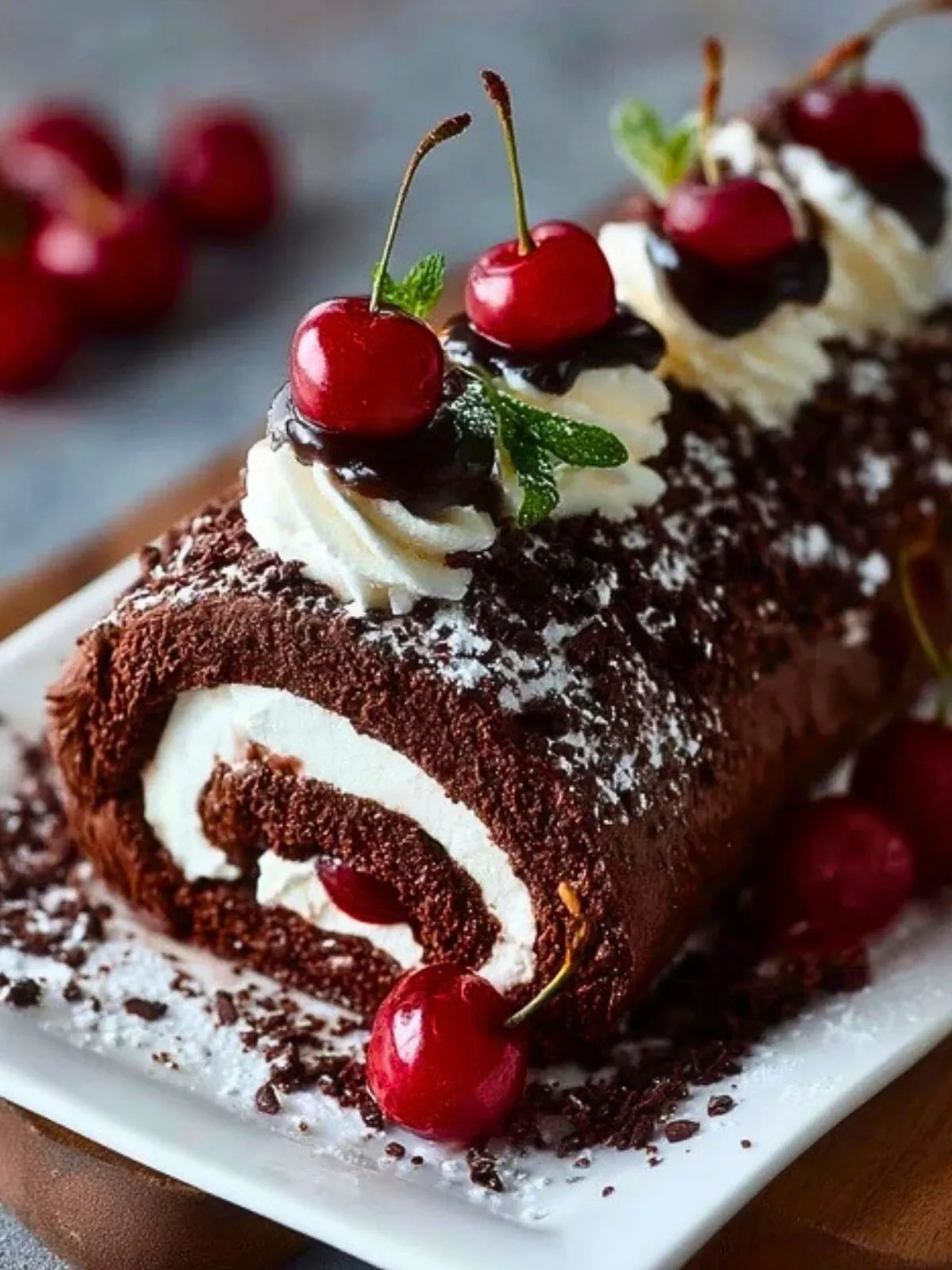 Keywords: bûche, forêt noire, Noël, roulé, chocolat, cerises