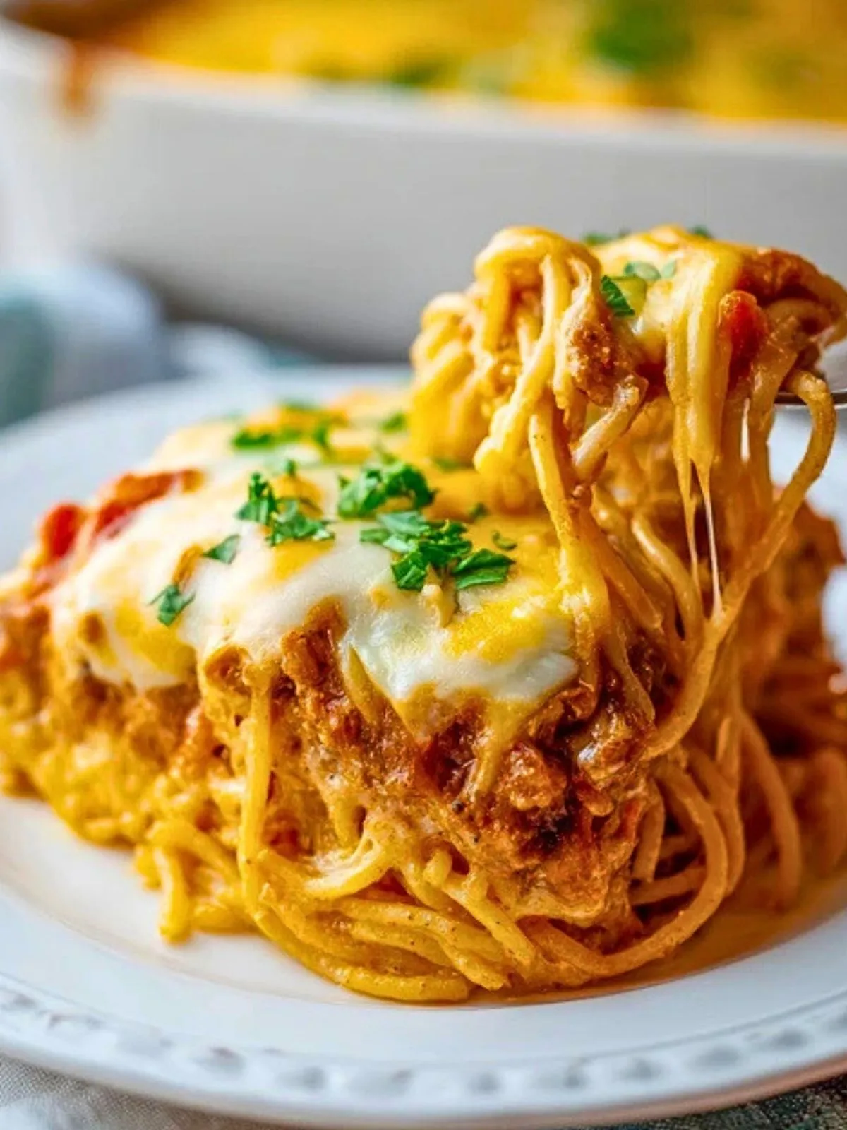 Servez la Casserole De Spaghetti Au Fromage Crémeux bien chaude, parsemée de persil frais ciselé. Elle s’accompagne parfaitement d’une salade verte croquante ou de légumes grillés.