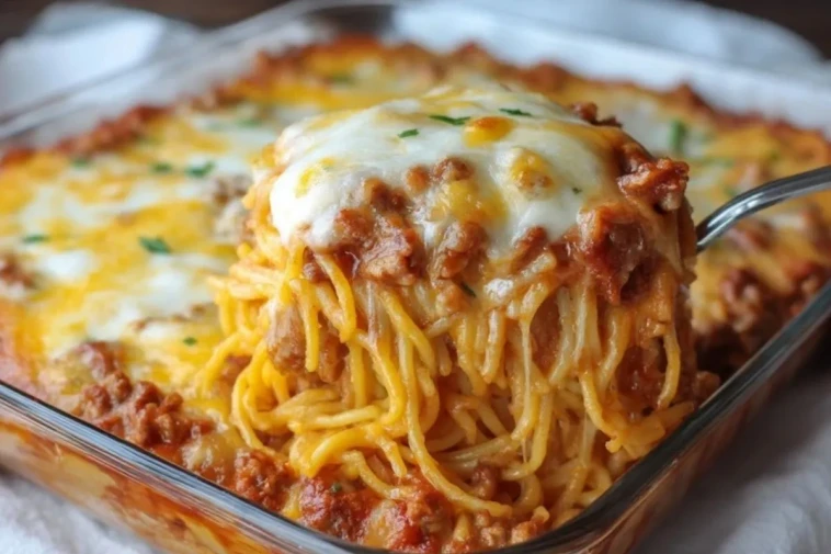 La Casserole De Spaghetti Au Fromage Crémeux est un plat familial généreux qui réunit des pâtes fondantes, une sauce bolognaise savoureuse et une couche irrésistible de fromage gratiné. Chaque bouchée offre un équilibre parfait entre la richesse de la viande mijotée, la douceur du fromage fondu et la texture tendre des spaghetti.