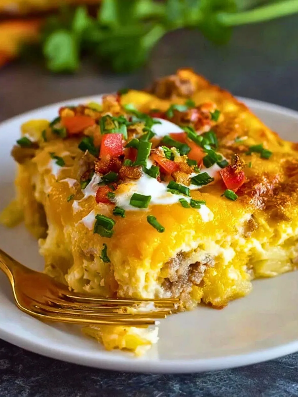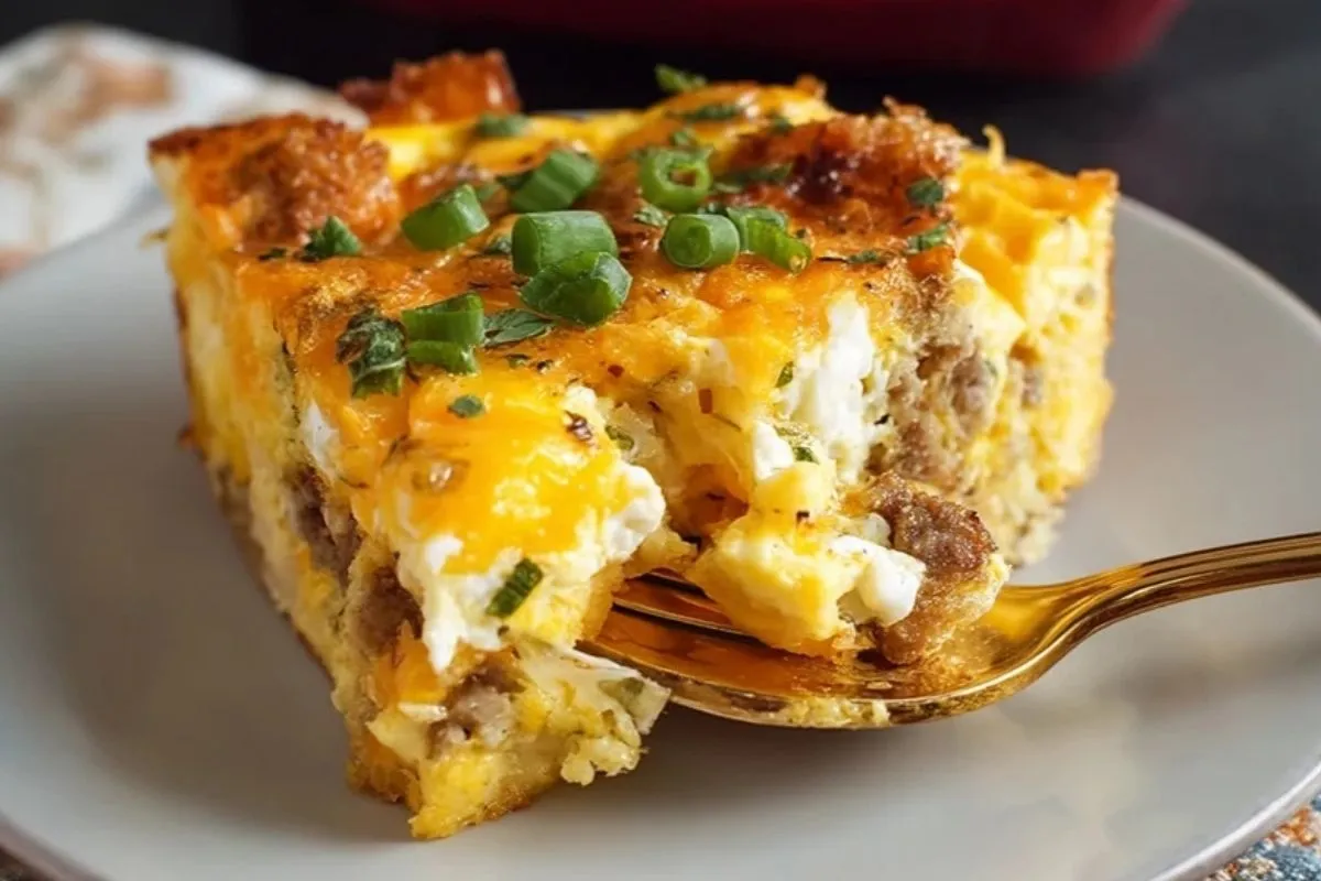 Il s’agit d’un gratin de petit déjeuner composé de couches de tortillas, de saucisse de petit déjeuner légèrement relevée, de légumes sautés et d’un appareil aux œufs et au lait qui cuit doucement au four. Le tout est nappé de fromage râpé qui gratine en surface. La texture est à mi-chemin entre une frittata, un gratin et un pain perdu salé, avec une touche tex-mex grâce aux épices et au cheddar.