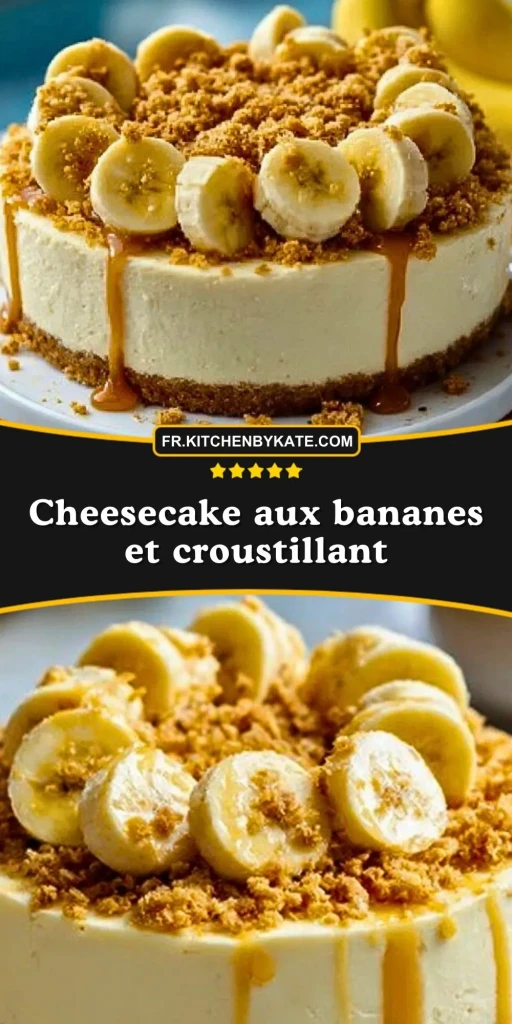 Ce cheesecake aux bananes et croustillant incarne la douceur et la gourmandise, avec sa base sablée, sa crème onctueuse au fromage frais parfumée à la banane, et sa généreuse garniture de crumble croquant. Le tout est sublimé par de belles rondelles de bananes fraîches et un filet de caramel fondant, pour un dessert qui plaira à tous les amateurs de douceurs fruitées.