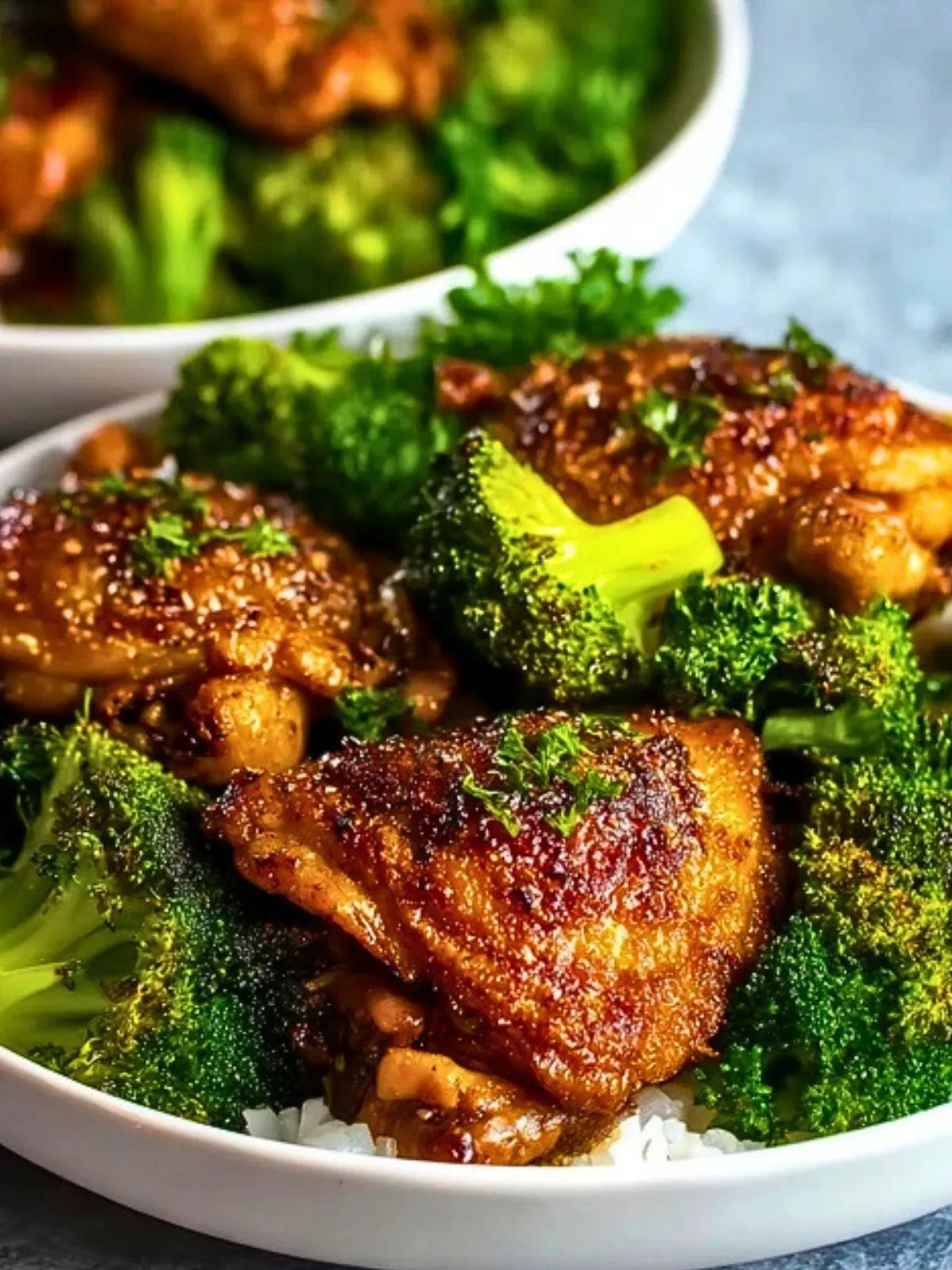 13. Répartissez le riz chaud dans des bols, ajoutez les brocolis rôtis et les cuisses de poulet par-dessus, arrosez d’un peu de jus de cuisson et servez immédiatement.