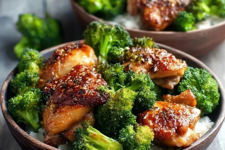 Ces cuisses de poulet croquantes avec brocoli sont rôties au four dans une marinade miel-soja à l’ail, puis servies sur un lit de riz pour un dîner complet, savoureux et prêt en moins de 45 minutes.
