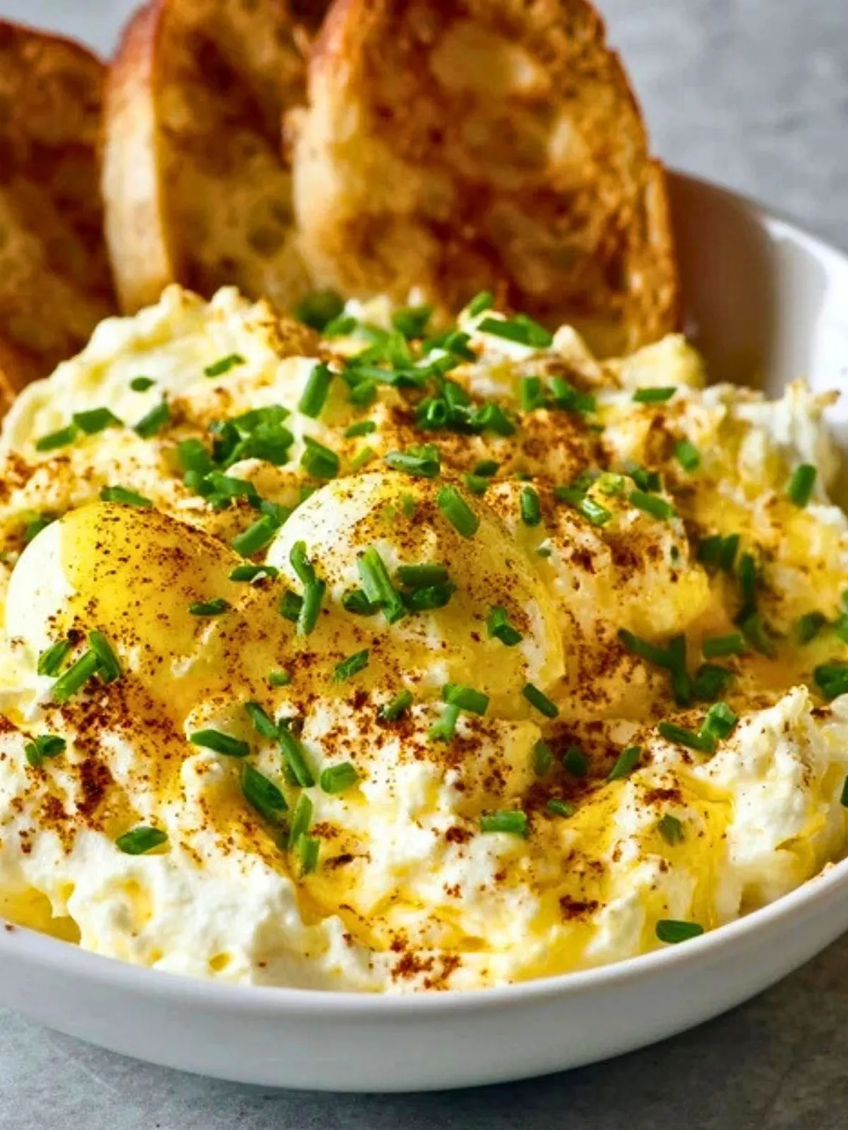 Transférez le dip aux œufs rémoulade dans un joli bol de service. Saupoudrez le dessus de paprika doux, ajoutez quelques rondelles d’oignons nouveaux réservées et, si vous le souhaitez, un peu de ciboulette supplémentaire pour la couleur.