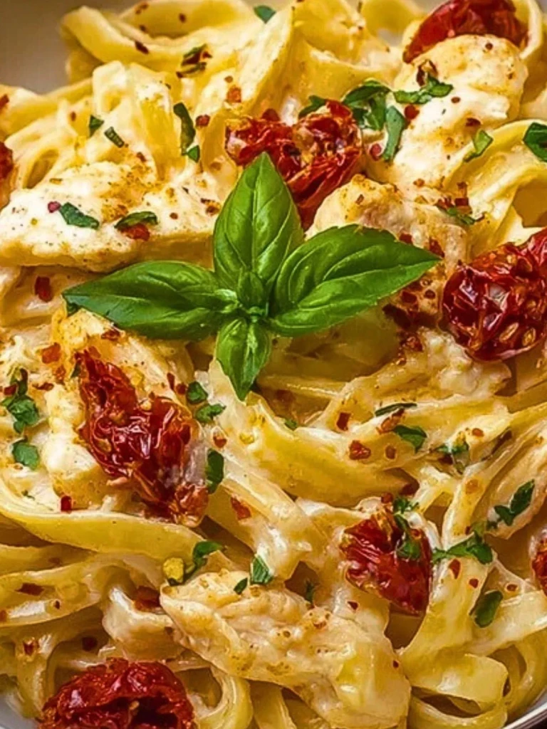 Un plat de pâtes crémeux et savoureux, mêlant des fettuccine nappés d’une sauce Alfredo maison, des morceaux de poulet dorés et des tomates séchées parfumées. Parfait pour un dîner chaleureux et gourmand.