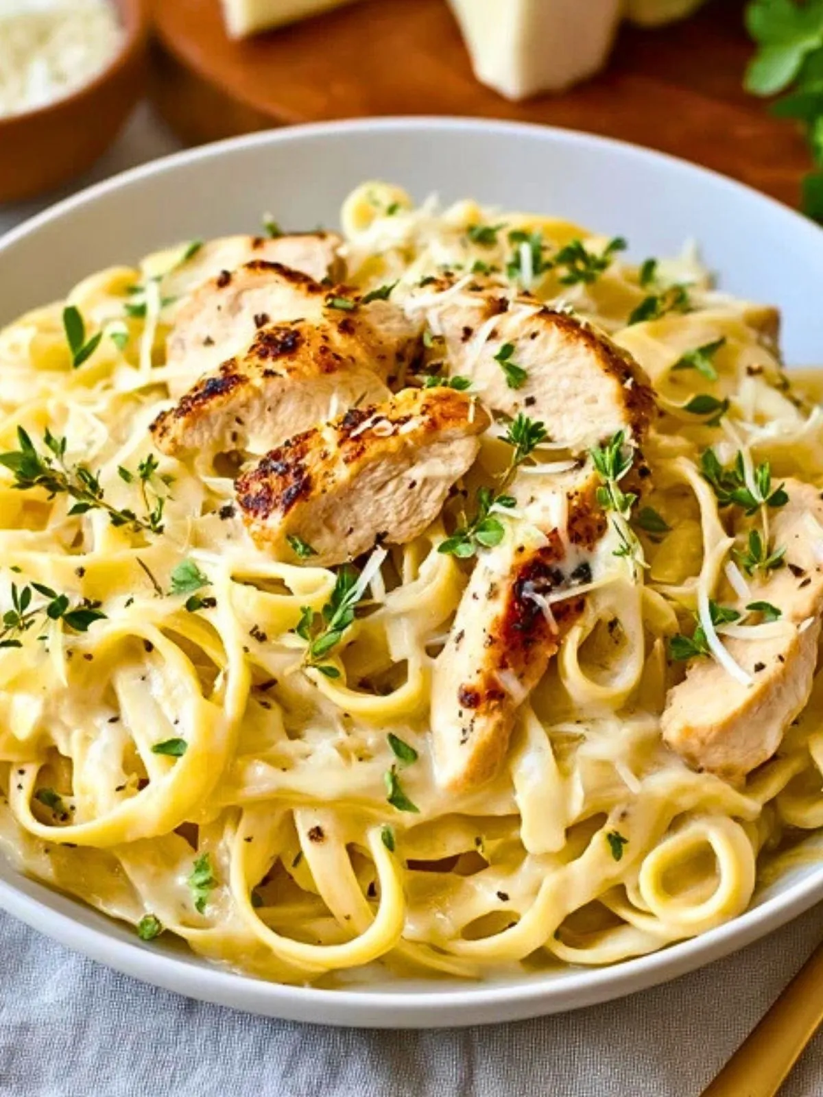 7. Incorporer le poulet tranché dans les pâtes ou déposer les morceaux par-dessus pour une jolie présentation. Parsemer de persil plat ciselé et d’un peu de parmesan supplémentaire. Servir immédiatement dans des assiettes creuses chaudes pour que la sauce reste parfaitement crémeuse.