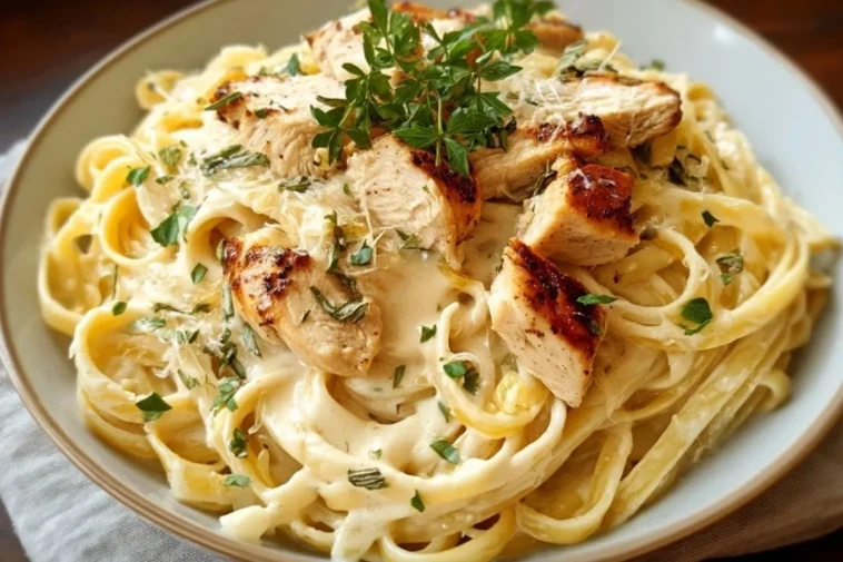 Une assiette de fettuccine nappées d’une sauce Alfredo riche et soyeuse, surmontées de morceaux de poulet dorés et juteux : c’est le genre de plat qui transforme un simple dîner en petit moment de fête. La sauce à base de crème, de beurre et de parmesan enrobe chaque ruban de pâtes, tandis que le poulet grillé apporte une touche de protéines et une délicieuse saveur rôtie.