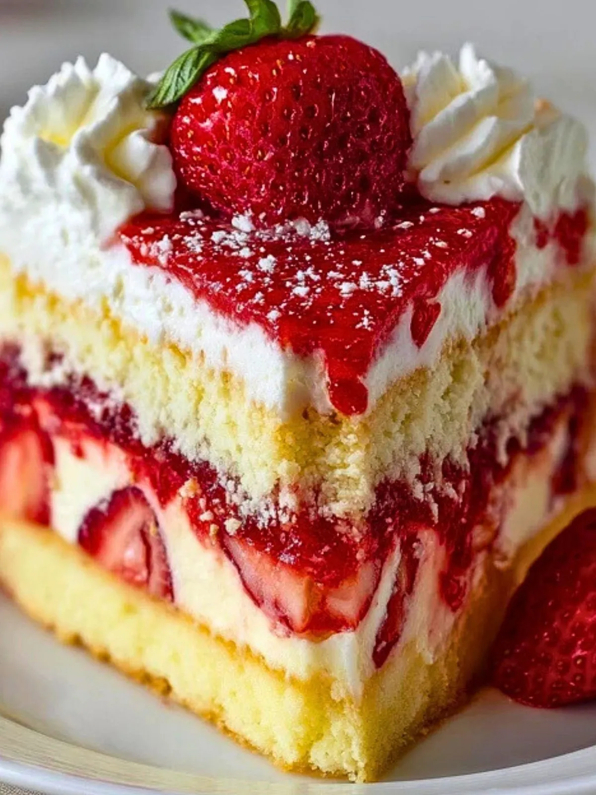 Ce gâteau aux fraises en tranches est un dessert frais et généreux composé de couches fondantes de crème vanillée, de génoise moelleuse et d’un abondant lit de fraises juteuses prises dans un coulis brillant.