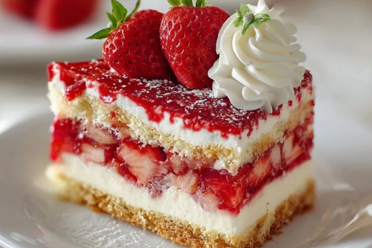 Ce gâteau aux fraises en tranches est un dessert frais et généreux composé de couches fondantes de crème vanillée, de génoise moelleuse et d’un abondant lit de fraises juteuses prises dans un coulis brillant. Chaque part révèle de magnifiques strates de rouge et de blanc, aussi belles à regarder qu’irrésistibles à déguster.