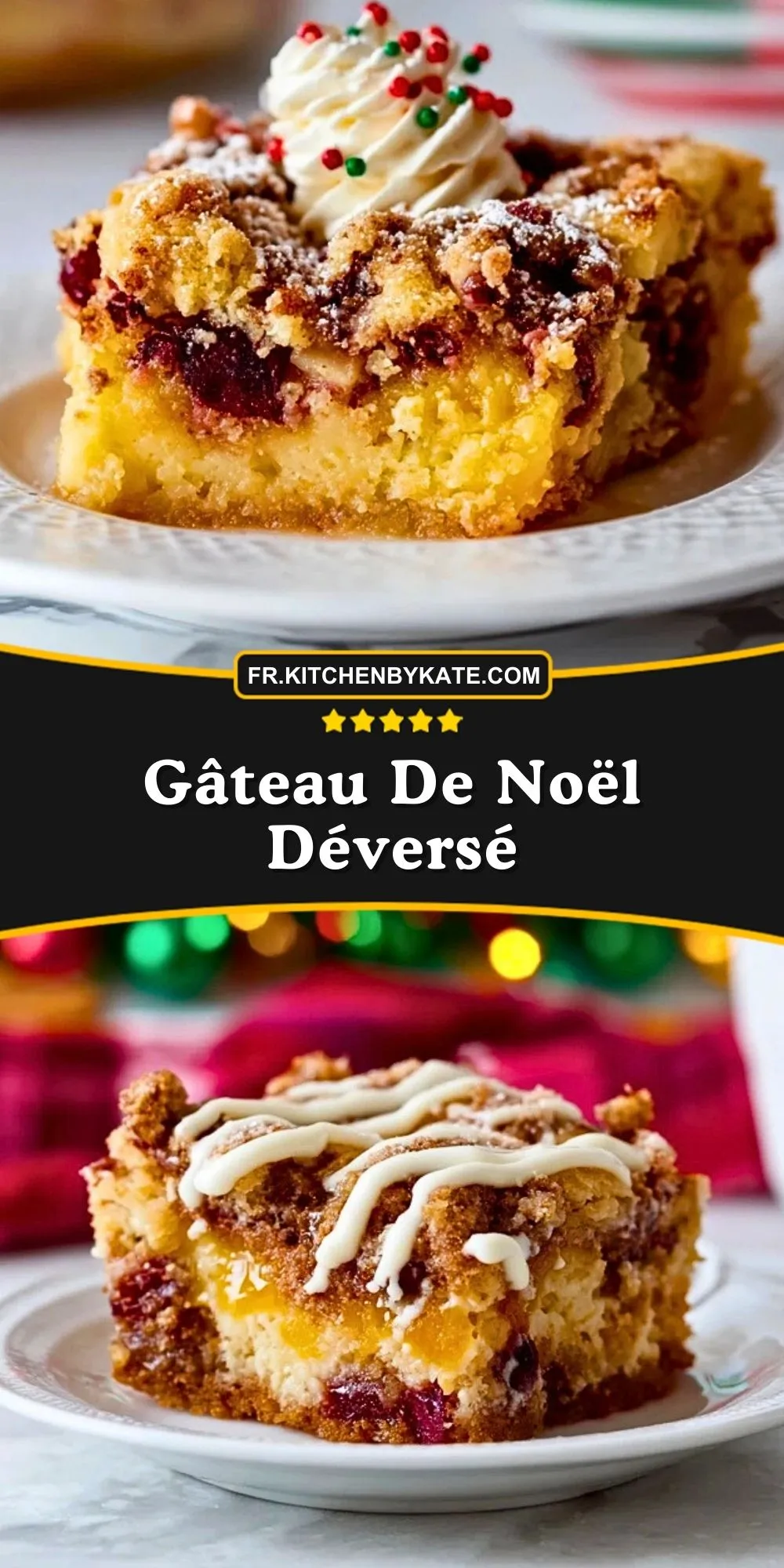 Le Gâteau de Noël Déversé est la gourmandise festive par excellence : une base moelleuse, un cœur fruité et une généreuse couche de crumble doré, le tout servi comme une part de bonheur à chaque bouchée. Ce dessert convivial, parfait pour les fêtes de fin d’année, marie la douceur du gâteau, la fraîcheur acidulée des fruits rouges et l’onctuosité d’une crème légère. Il est aussi beau à voir que réconfortant à partager autour de la table.