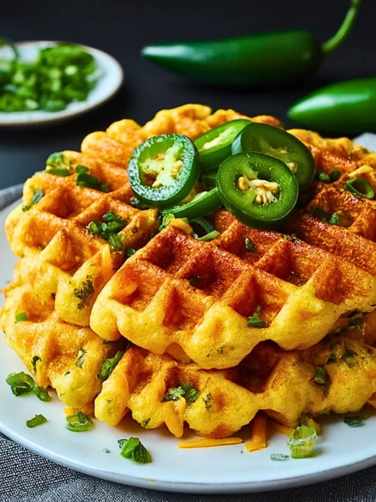 Disposez les gaufres sur un plat, garnissez avec le reste des rondelles de jalapeño et un peu de ciboule fraîche. Servez immédiatement pour garder le croustillant.