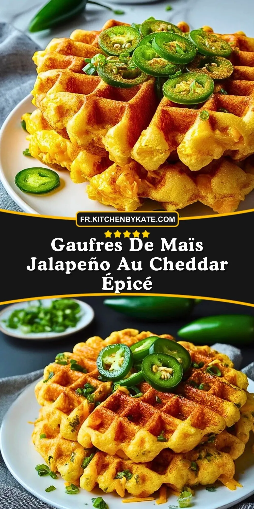 Servies chaudes, ces gaufres croustillantes laissent échapper des effluves de fromage fondu et de maïs doré. Les rondelles de jalapeño apportent une touche de pep’s, et la ciboule fraîche équilibre le tout avec une note végétale. Délicieuses seules, elles peuvent aussi accompagner une salade croquante, un œuf poché ou même du poulet frit pour une assiette tex-mex gourmande.