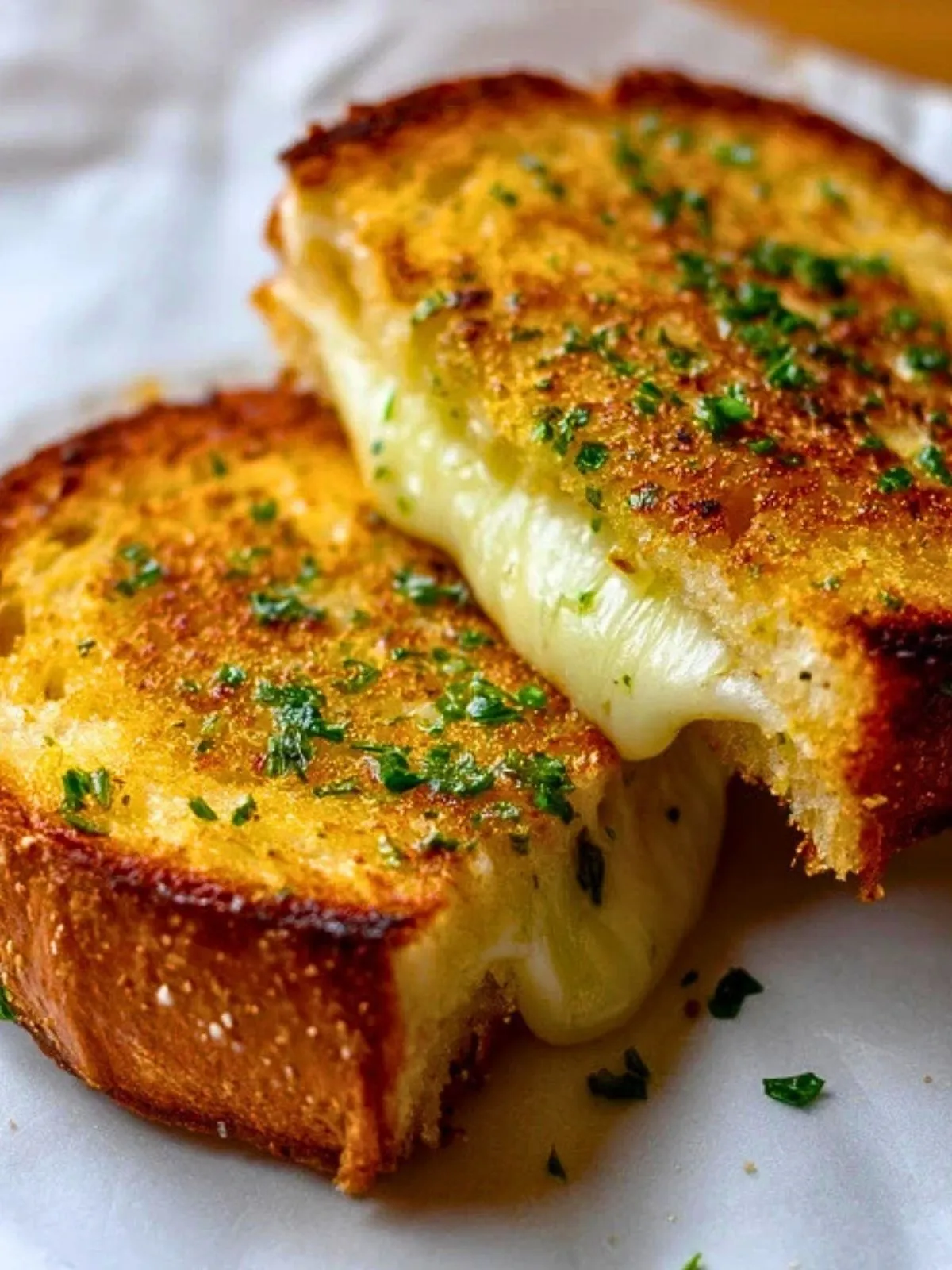 Un pain perdu au fromage a l ail croustillant a l exterieur et fondant a l interieur, garni de mozzarella et de fromage rape, parfume a l ail et dore au beurre. Ideal pour un brunch, un diner rapide ou un repas reconfortant.