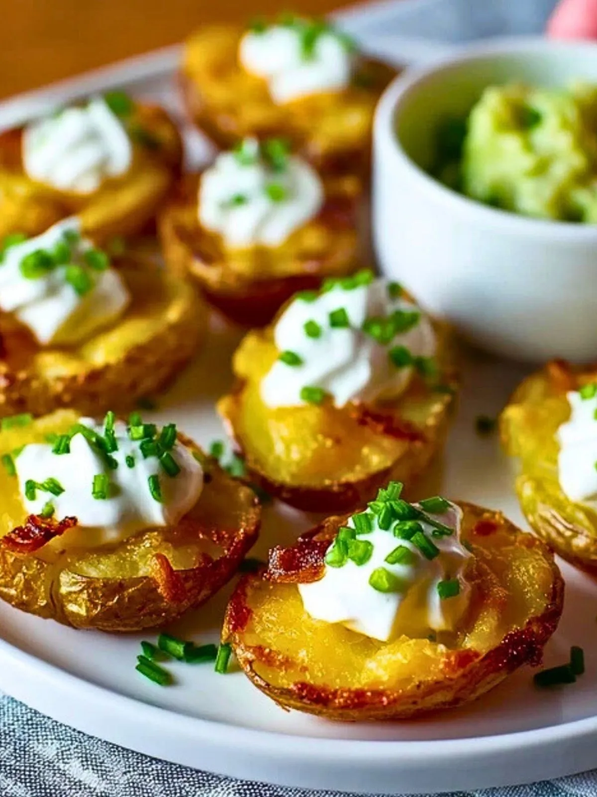 Servez ces peaux de pommes de terre croustillantes miniatures bien chaudes sur un grand plat, idéalement accompagnées d’une sauce supplémentaire : crème fraîche citronnée, sauce au yaourt et aux herbes, ou même une sauce au fromage blanc et moutarde. Elles se marient à merveille avec d’autres bouchées apéritives comme des dips de légumes, des planches de charcuterie ou des mini-burgers.