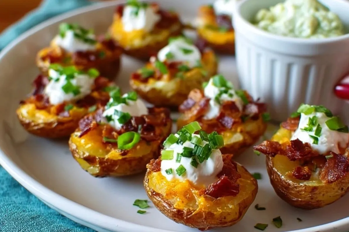 Ces petites peaux de pommes de terre croustillantes miniatures sont exactement le genre de bouchées qui disparaissent en un clin d’œil sur la table de l’apéro. Entre la peau dorée et craquante, le cœur fondant de pomme de terre et la garniture ultra gourmande au fromage, au bacon et à la crème, chaque bouchée est un concentré de réconfort.
