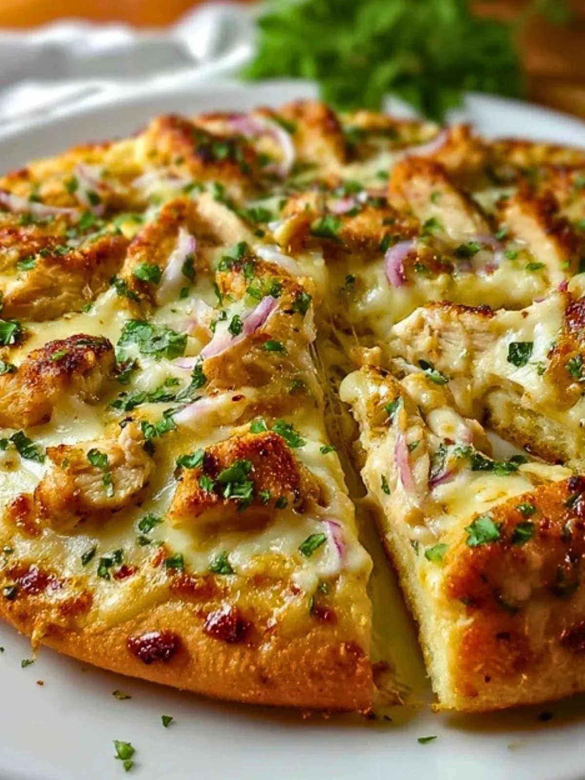 Pizza au Poulet Alfredo à l’Ail marie une pâte moelleuse et croustillante, une sauce crémeuse à l’ail et au parmesan, des morceaux de poulet tendre, de la mozzarella filante et du persil frais. Idéale pour un dîner convivial, elle séduit tous les amateurs de recettes maison savoureuses.