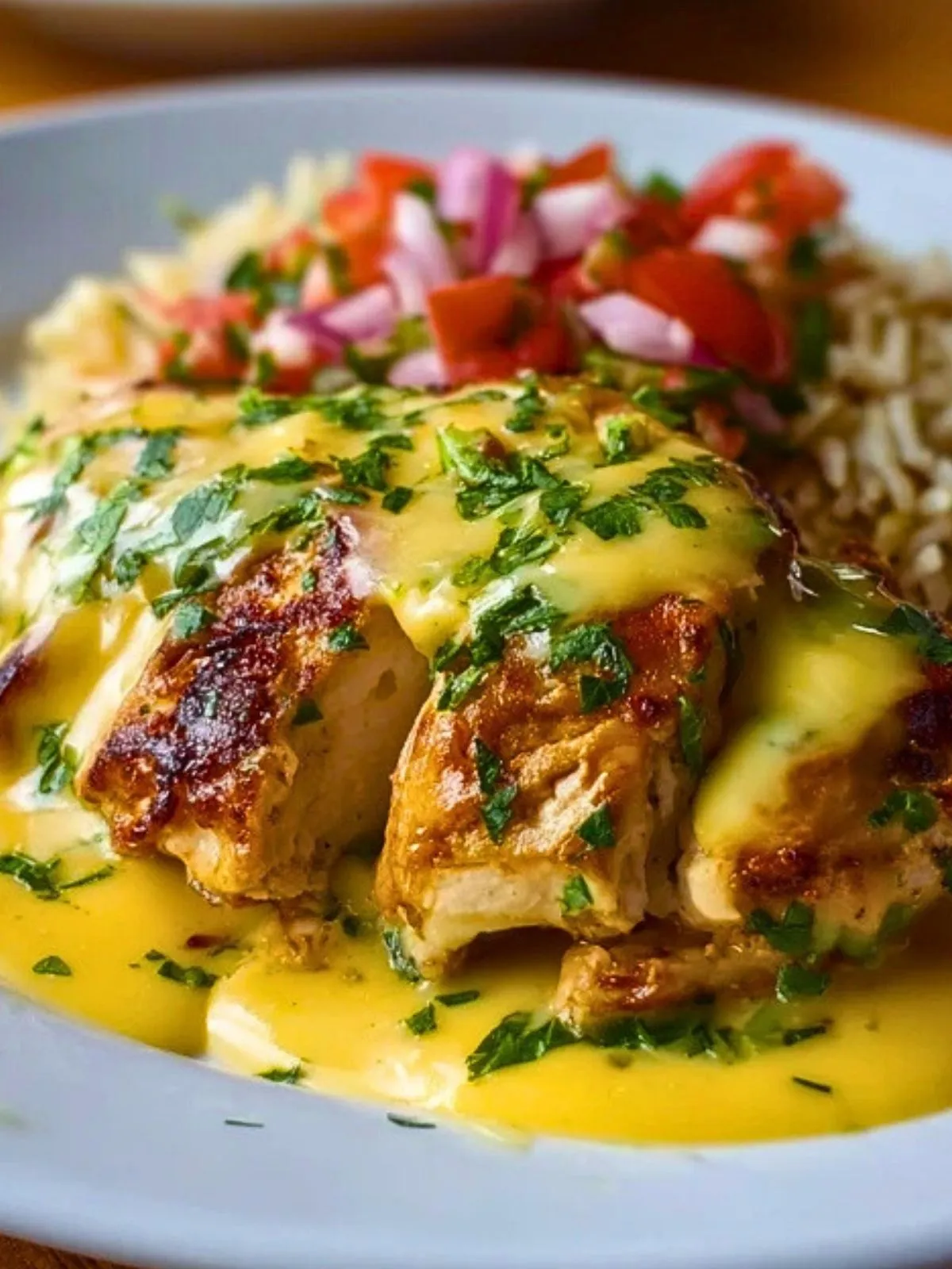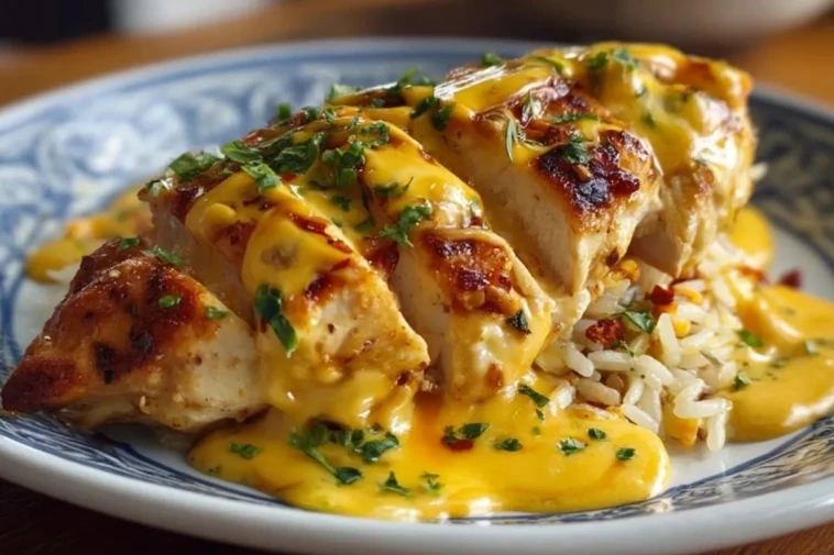 Ce poulet mexicain avec sauce fromagère est la définition même du plat réconfortant : des blancs de poulet joliment dorés, parfumés aux épices mexicaines, nappés d’une sauce au fromage onctueuse qui fond sur un lit de riz. Chaque bouchée mêle le fondant du poulet, la chaleur douce des épices et la gourmandise du cheddar.