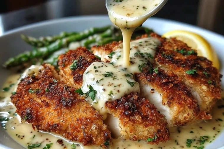 Des blancs de poulet panés croustillants, servis nappés d’une sauce crémeuse à l’ail et au parmesan. Ce plat ultra réconfortant, facile à réussir, est idéal pour un dîner en famille ou entre amis. La panure dorée, le parfum du parmesan et la douceur de la sauce font voyager les papilles en Italie en une bouchée.