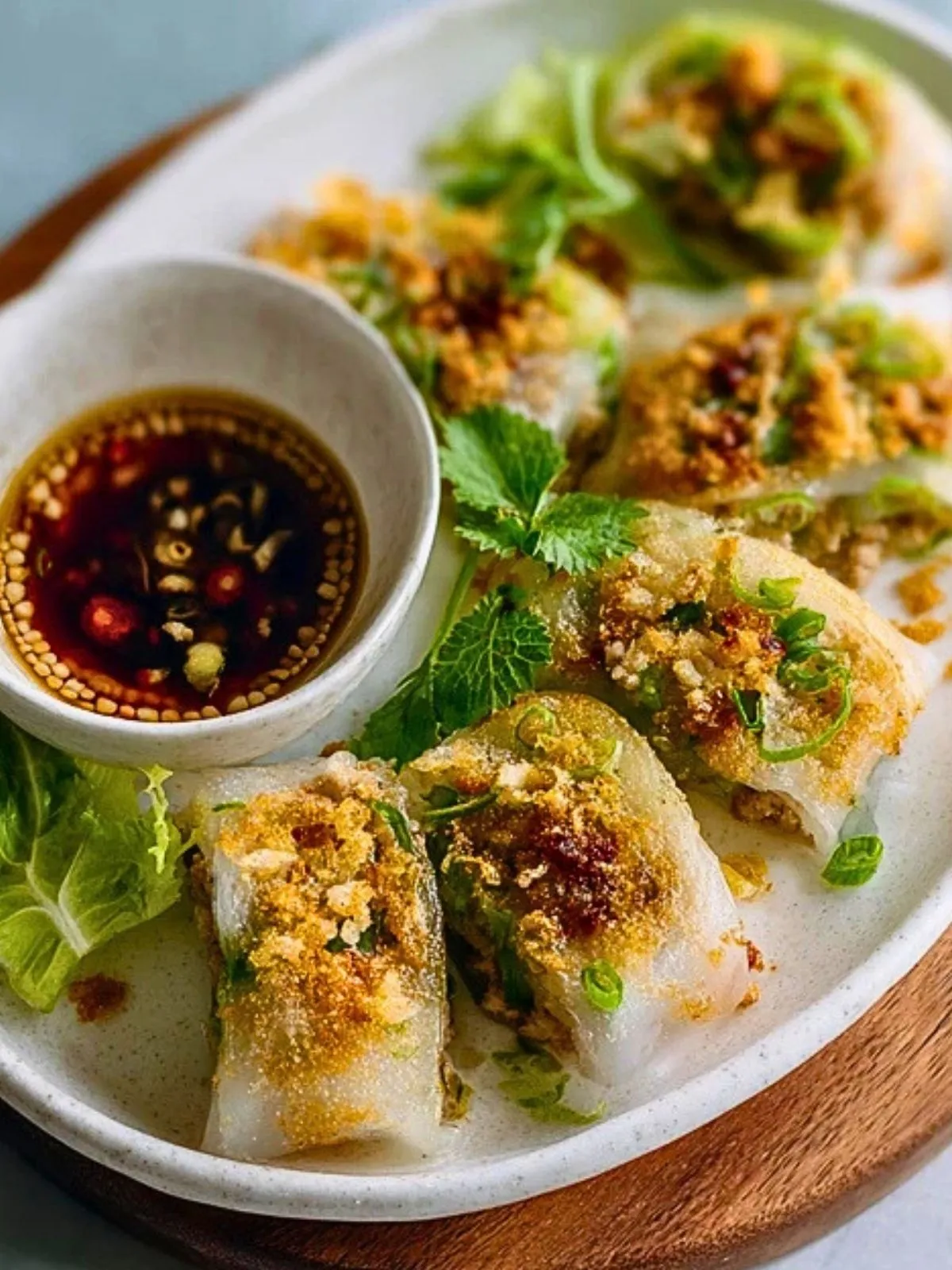 Ces ravioles de papier de riz farcies à la dinde croquante sont de petites bouchées dorées et parfumées, parfaites pour un apéritif dînatoire ou un dîner léger. La viande de dinde assaisonnée aux saveurs asiatiques est délicatement enveloppée dans une feuille de riz souple, puis poêlée jusqu’à ce qu’elle devienne légèrement croustillante à l’extérieur tout en restant juteuse à l’intérieur.