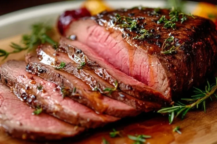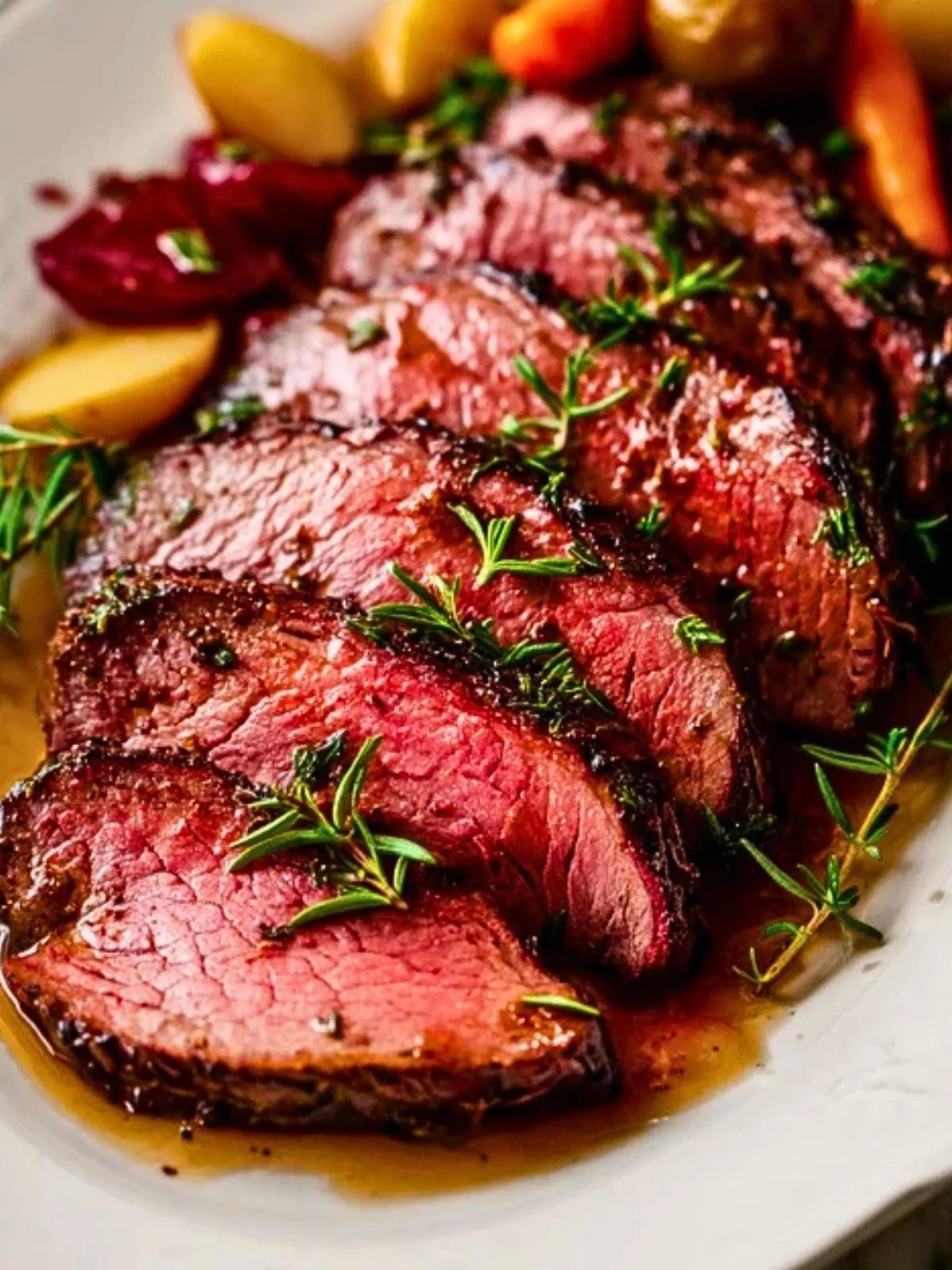Ce rôti de rumsteck juteux est doré à la poêle puis fini au four avec ail, thym et romarin pour une viande tendre et parfumée, parfaite pour un repas de fête ou un dîner du dimanche.