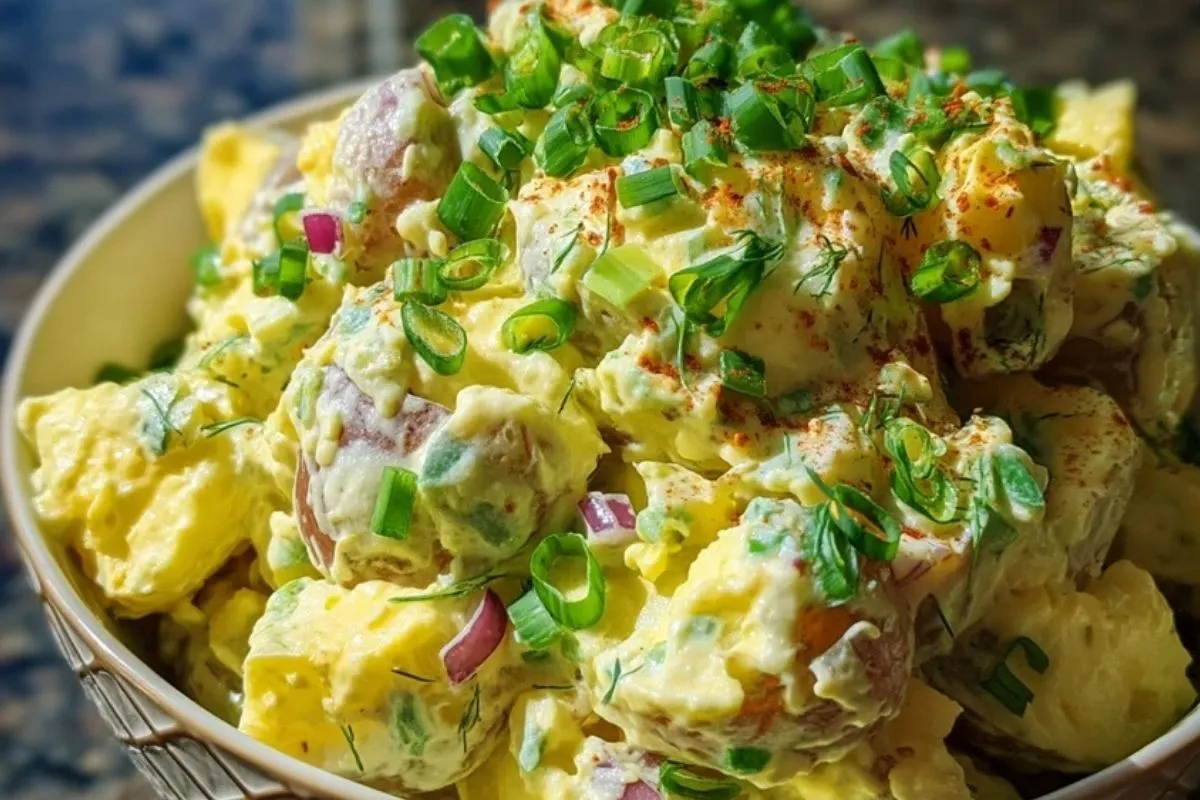 Une salade crémeuse à base de pommes de terre, œufs durs, cornichons et herbes fraîches, nappée d’une sauce onctueuse à la moutarde et à la mayonnaise. Parfaite pour les pique-niques, barbecues et repas d’été en famille ou entre amis.
