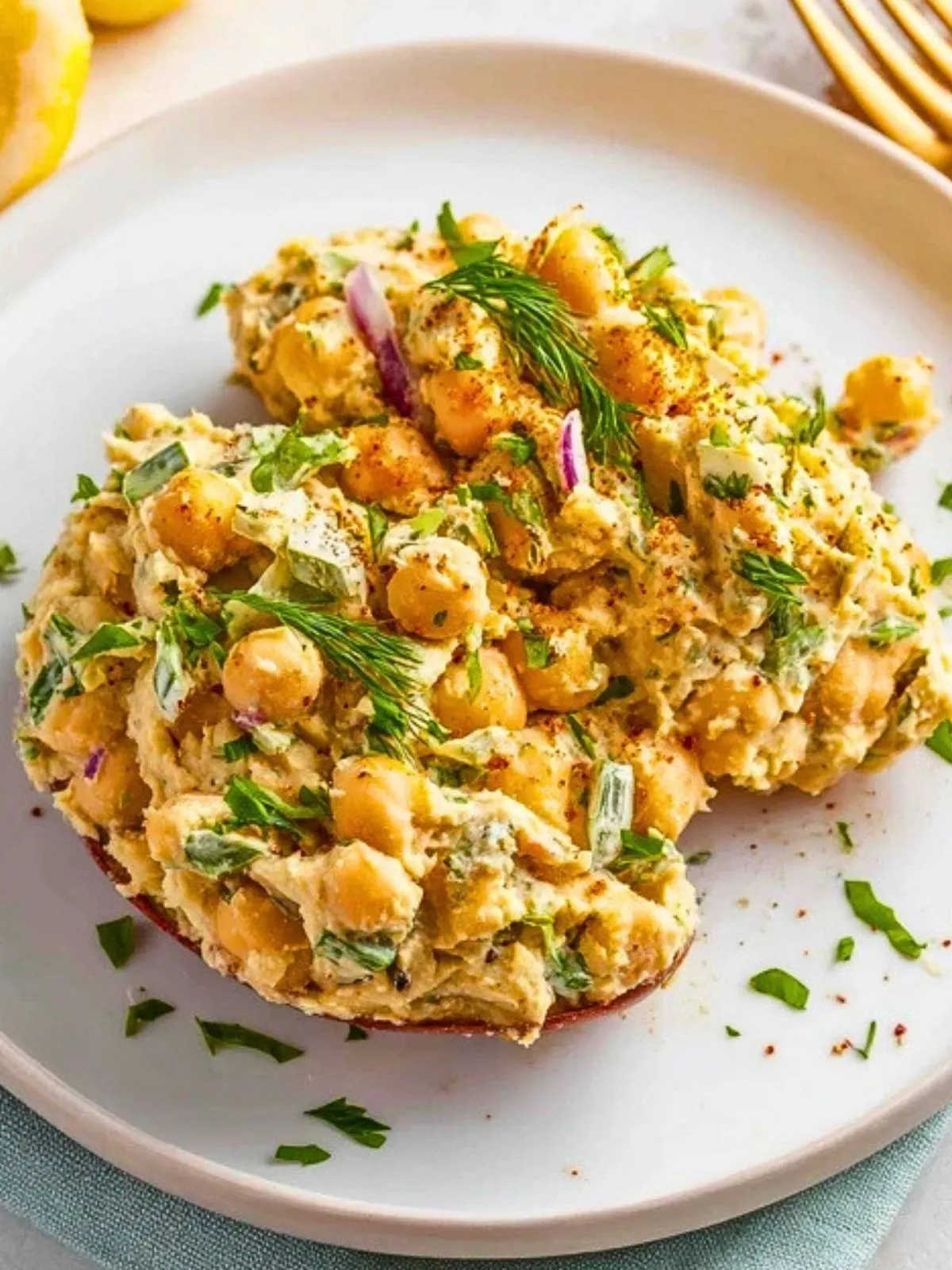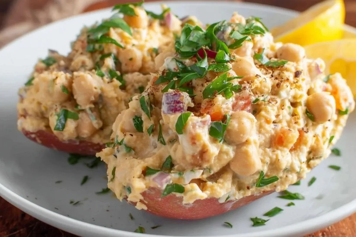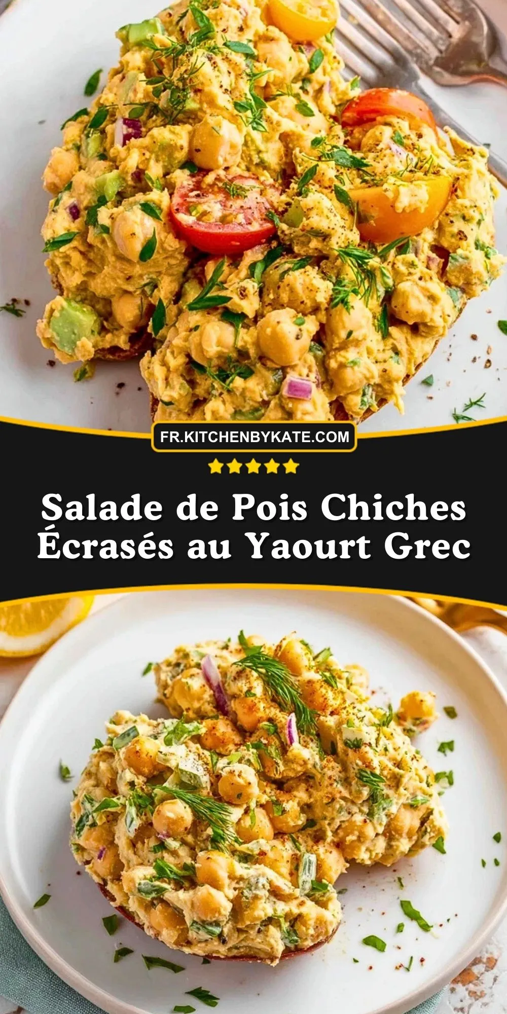 Cette salade de pois chiches écrasés au yaourt grec est une option rapide, fraîche et riche en protéines, parfaite pour un déjeuner sain ou un dîner léger.
