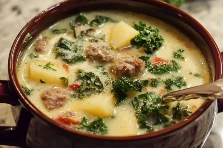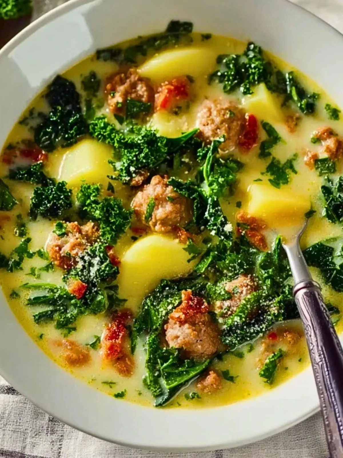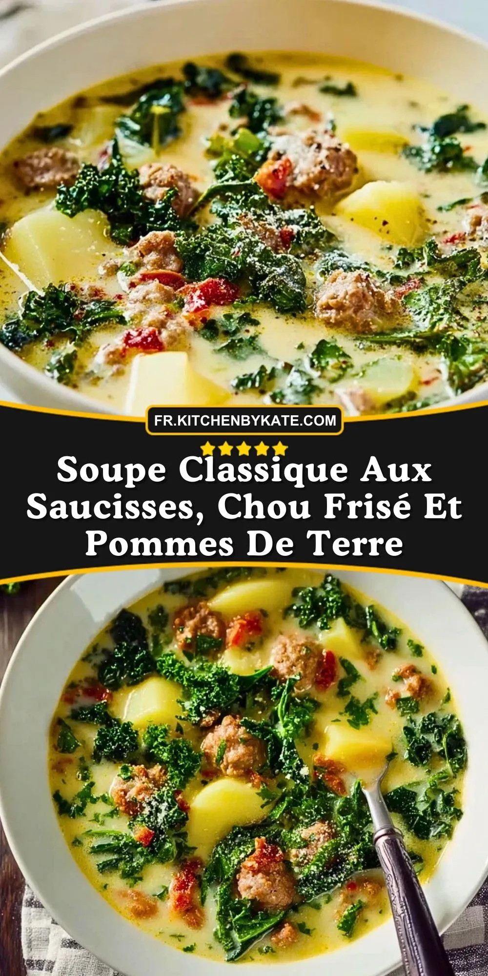 Cette soupe classique aux saucisses, chou frisé et pommes de terre est le genre de plat généreux qui réchauffe instantanément la table. Avec son bouillon crémeux, ses morceaux de pommes de terre fondants, ses saucisses savoureuses et le caractère rustique du chou frisé, elle offre un équilibre parfait entre réconfort et simplicité.