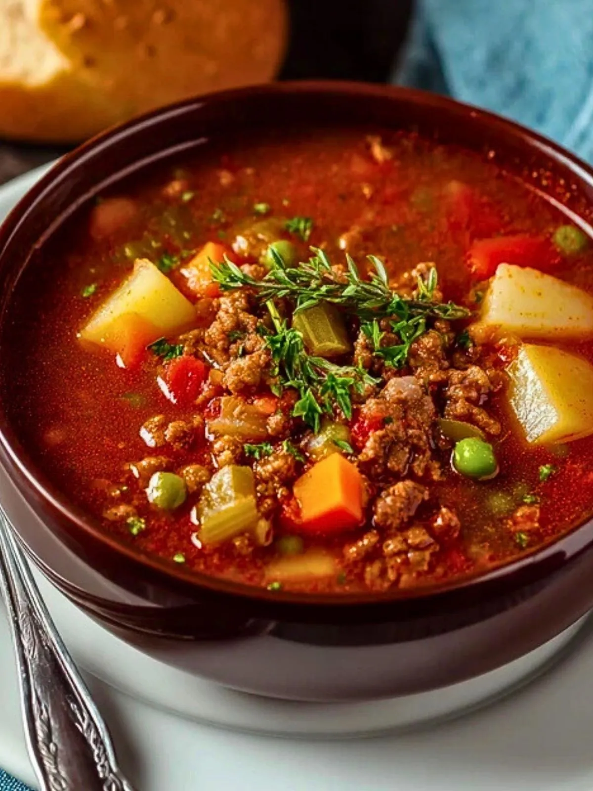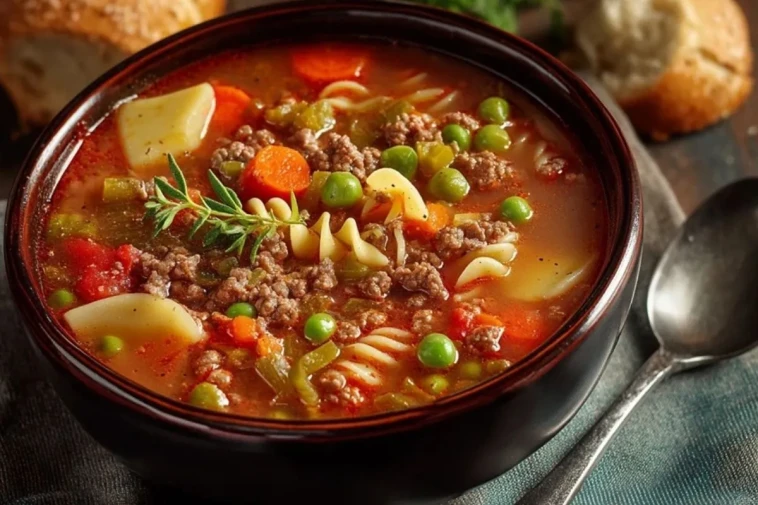 Cette soupe classique de viande hachée est une soupe complète et réconfortante, riche en légumes, en bœuf savoureux et en petites pâtes, parfaite pour un dîner familial simple et nourrissant.
