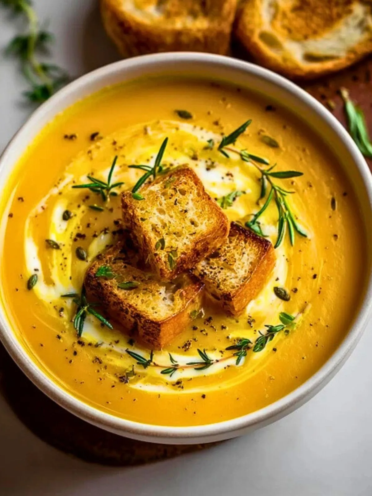 Les cubes de courge dorés à la perfection, relevés d’herbes fraîches et accompagnés de croûtons maison, transforment une simple soupe en un plat élégant, rassasiant et réconfortant. Cette soupe, aussi belle que délicieuse, met en valeur les produits de saison tout en simplicité.
