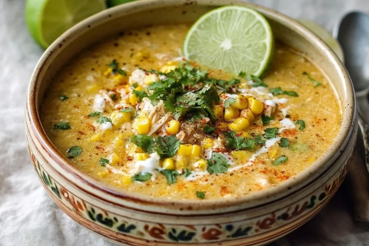 Servez la soupe bien chaude, garnie de maïs réservé, de coriandre fraîche, d’un filet de crème, et d’un quartier de citron vert.