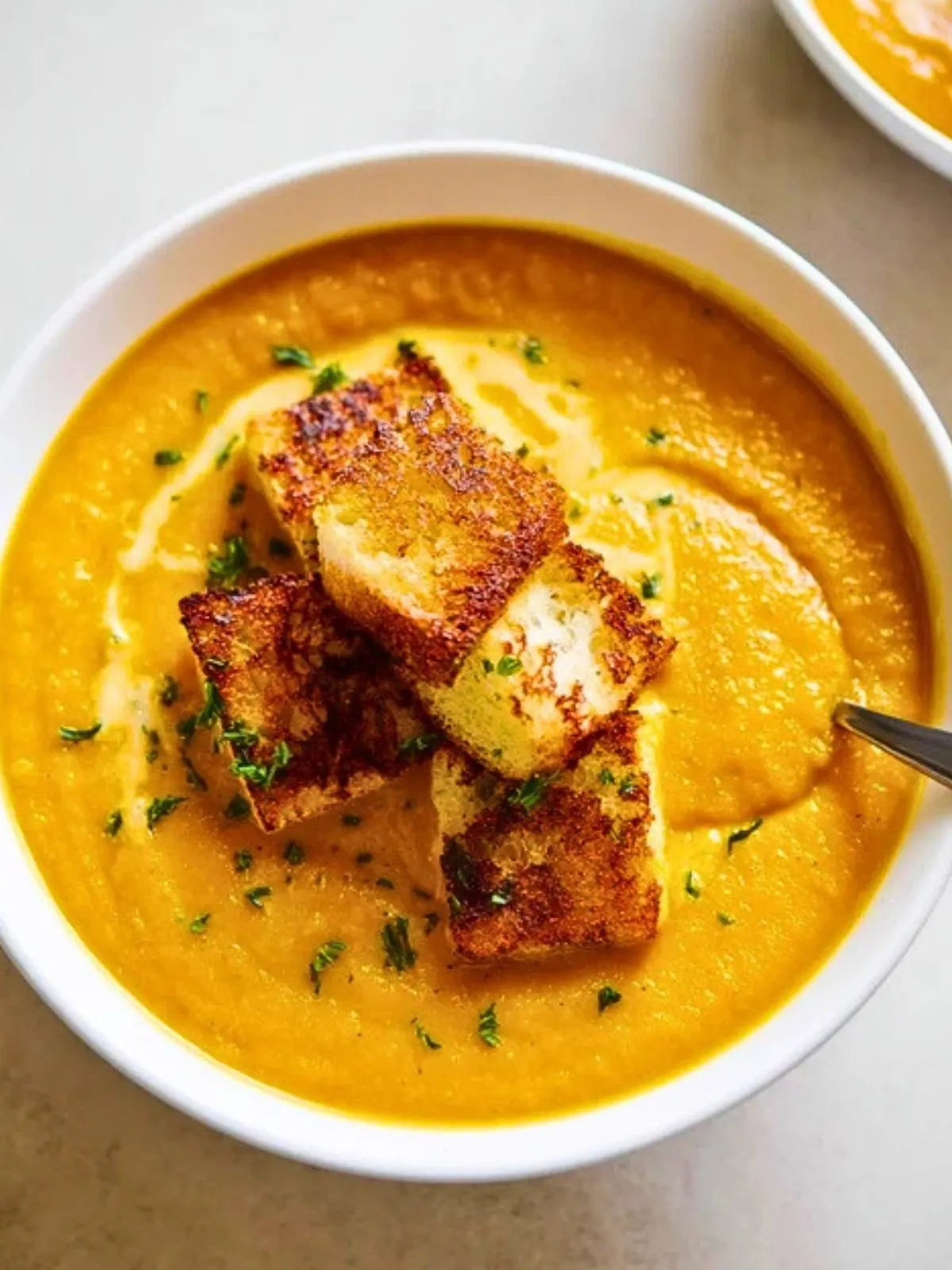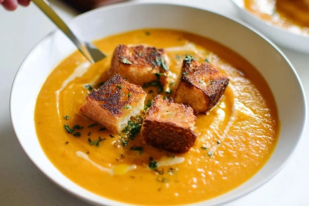 Soupe de Potiron Épicée avec Croûtons de Fromage Grillé