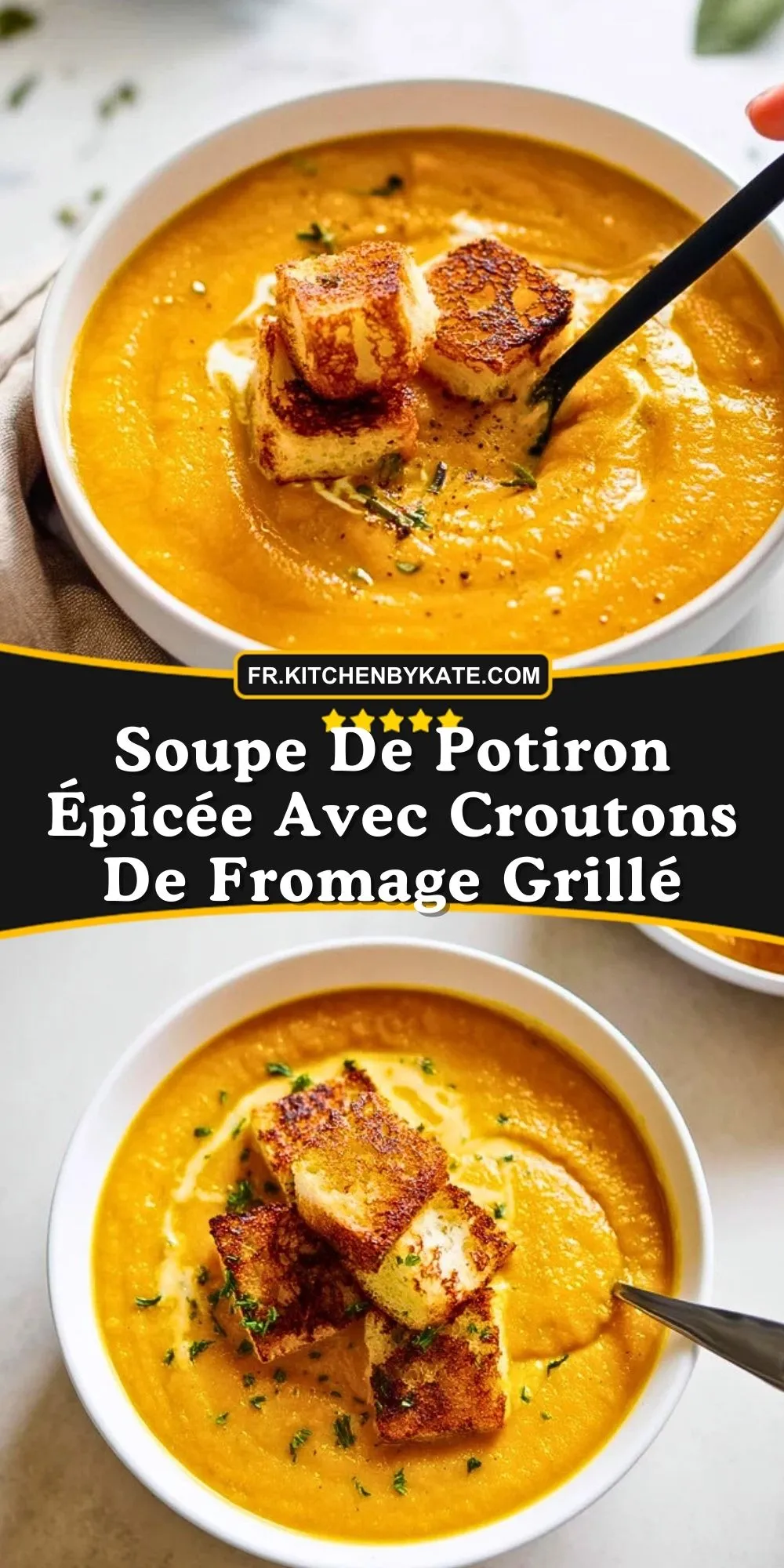 Quand l’automne s’installe, rien de plus réconfortant qu’un grand bol de soupe de potiron épicée, onctueuse à souhait, relevée juste ce qu’il faut, et parsemée de croûtons de pain dorés au fromage grillé. Cette recette, à la fois généreuse et gourmande, offre un équilibre parfait entre la douceur du potiron, le pep’s des épices et le côté fondant et croustillant des croûtons au fromage. Un vrai plat complet pour réchauffer les soirées fraîches ou épater lors d’un dîner léger.