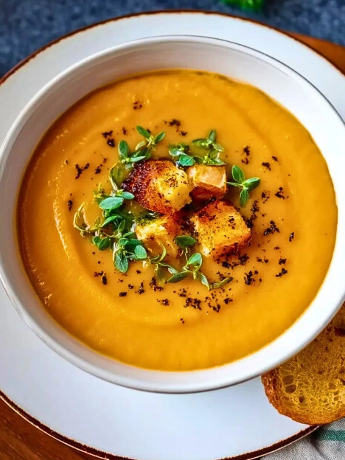Une soupe italienne onctueuse et colorée, composée de patates douces rôties, relevées d’herbes fraîches et d’un filet d’huile d’olive. Toute la douceur et les parfums du Sud dans un bol réconfortant, parfait en entrée ou en plat léger avec des croûtons.