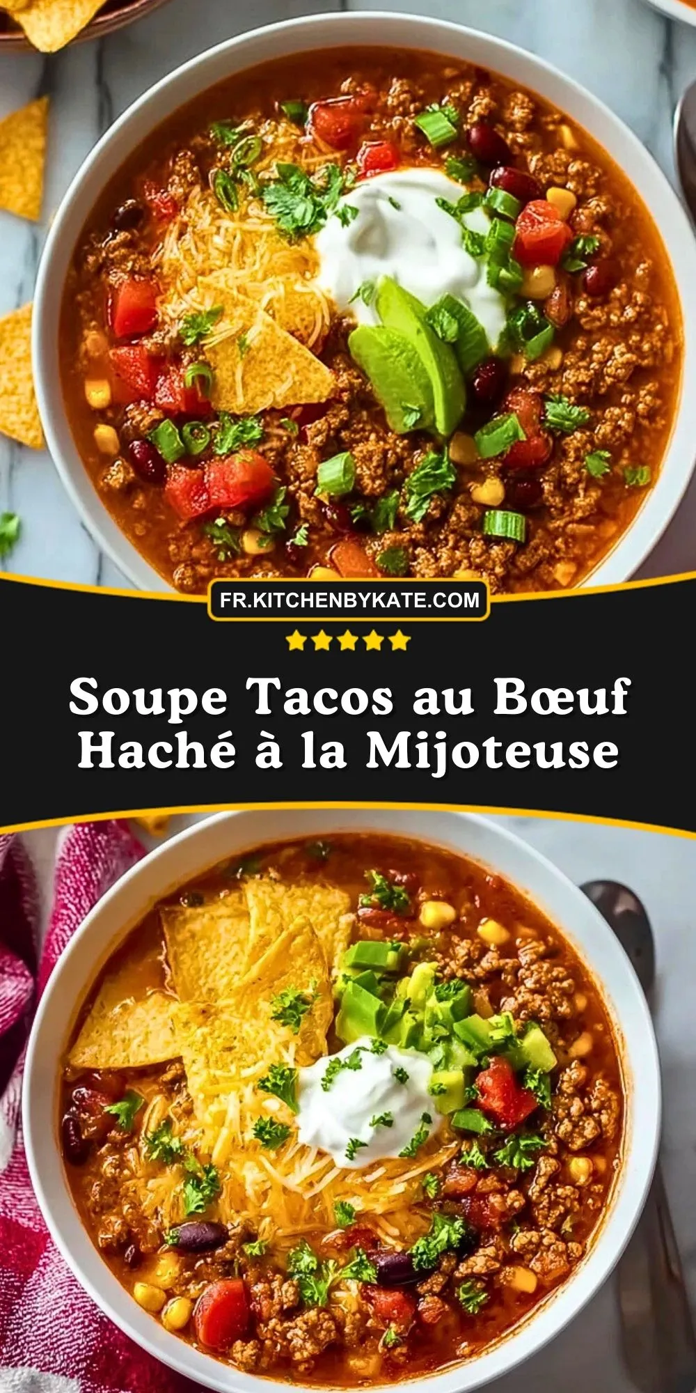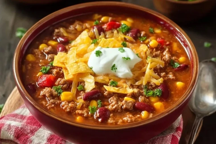 Cette soupe tacos au bœuf haché à la mijoteuse est copieuse, savoureuse et parfaite pour les repas sans stress. Le bœuf, les haricots rouges, le maïs, les tomates et les épices mijotent lentement pour créer une soupe riche et réconfortante, à servir avec du fromage râpé, de la crème fraîche et des chips tortilla croquantes.