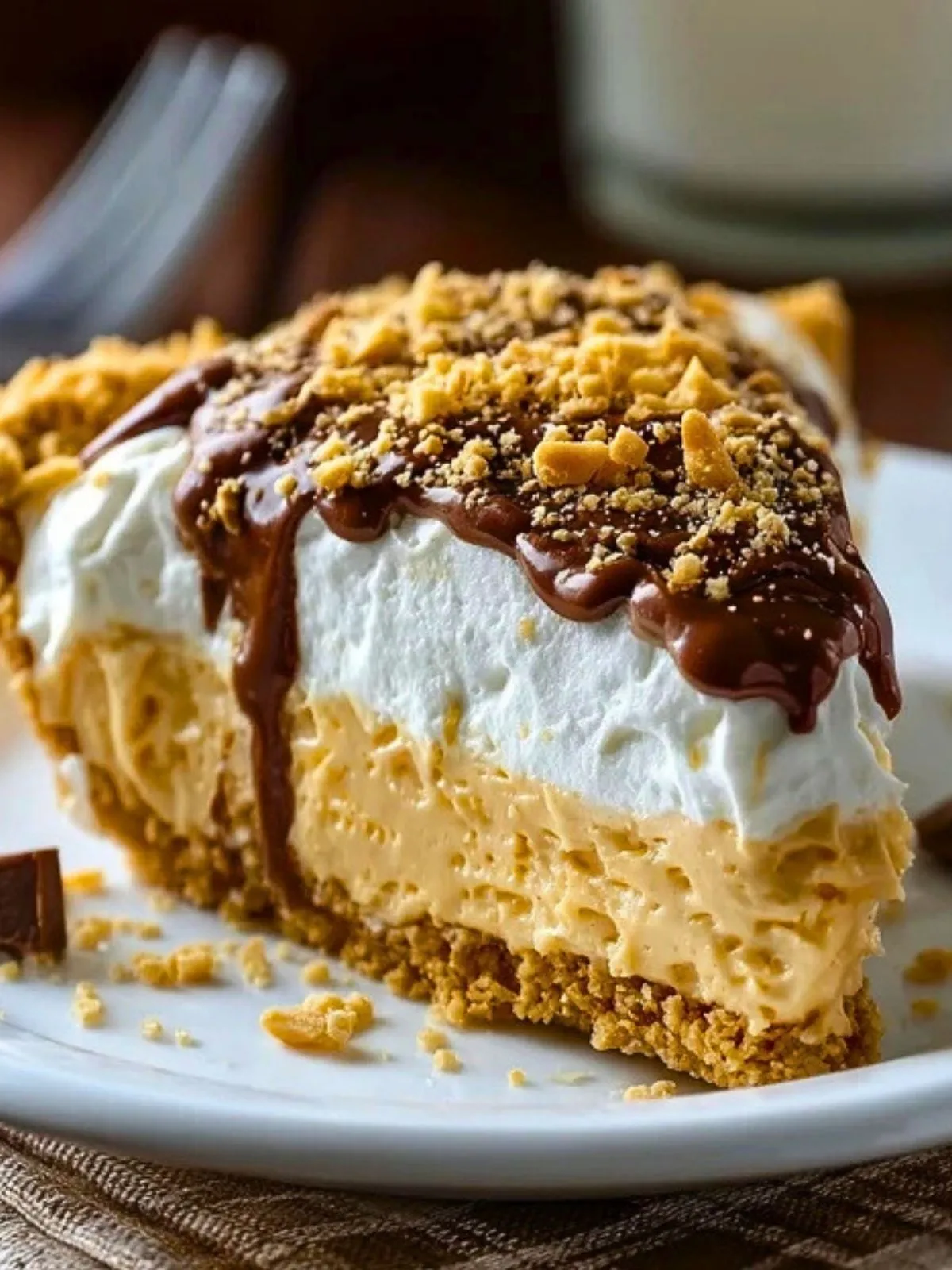 La magie de cette tarte vient de son équilibre de textures et de saveurs : la croûte croquante de biscuits au beurre contraste avec la garniture au beurre de cacahuète, légère comme une mousse, tandis que la chantilly apporte de la fraîcheur et que le chocolat et le caramel ajoutent une touche encore plus gourmande. Tout cela sans allumer le four, avec des ingrédients simples que l’on trouve facilement en France.