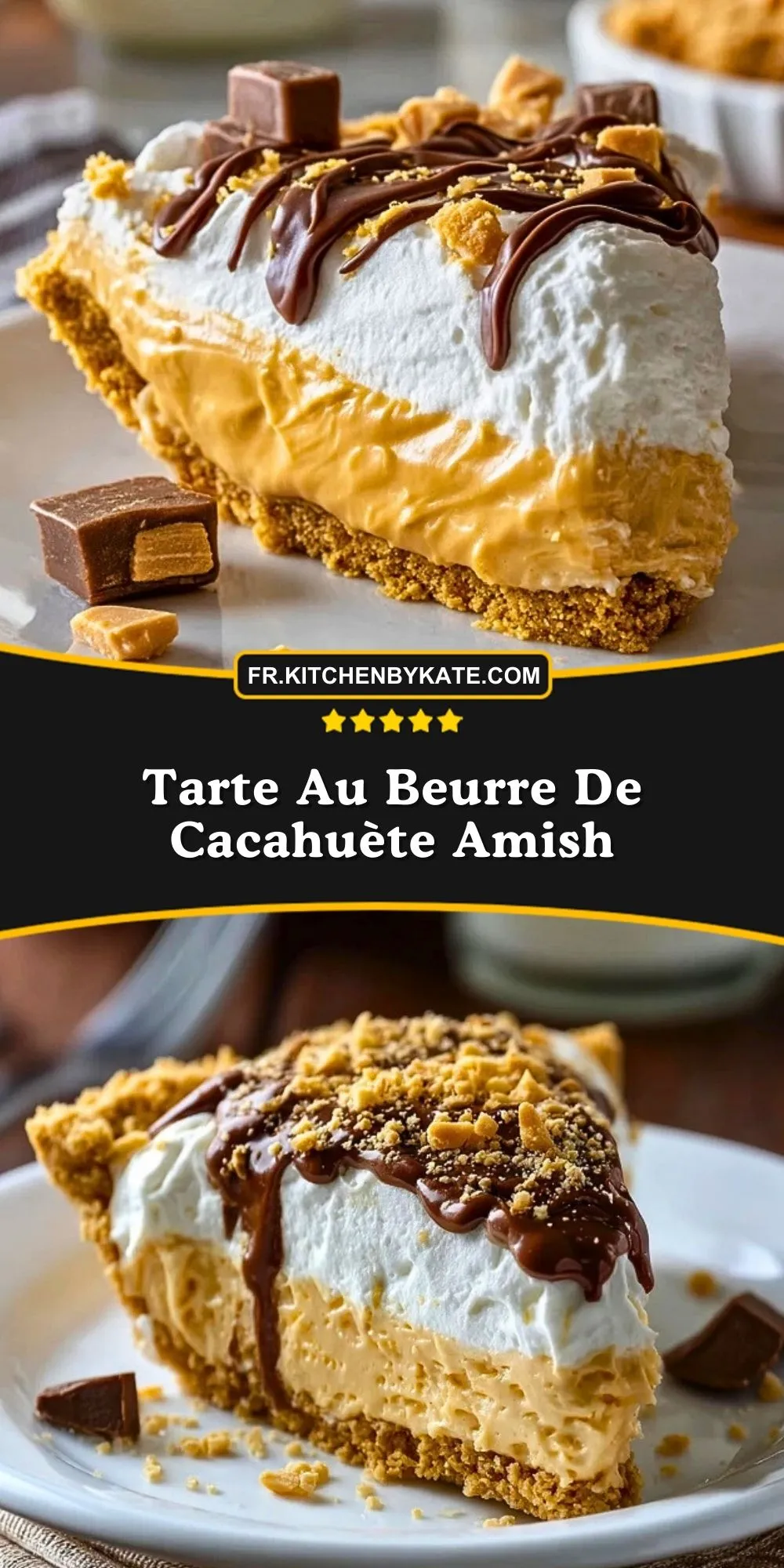 Inspirée des tables généreuses des communautés Amish, cette tarte au beurre de cacahuète est le genre de dessert qui fait briller les yeux dès qu’on la pose sur la table. Une base croustillante de biscuits, une couche ultra crémeuse au beurre de cacahuète, un nuage de chantilly et un filet de chocolat… chaque bouchée est douce, onctueuse et délicieusement régressive.